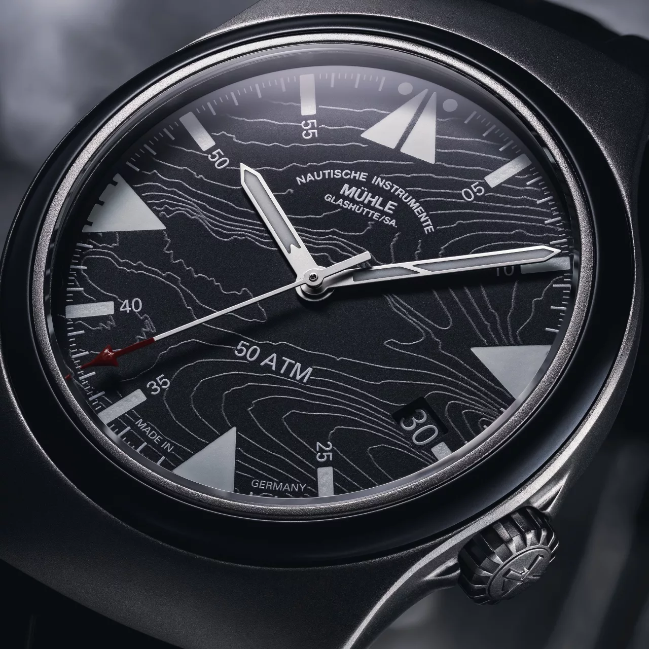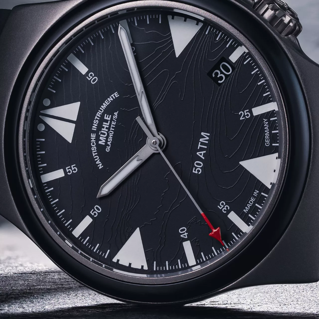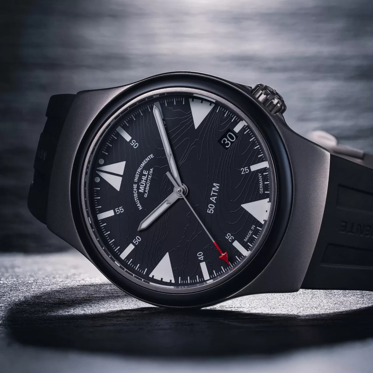 The titanium grey dial is styled with functional clarity in mind. It incorporates a fine line pattern referencing topographical isolines of the North Sea near Bremerhaven – the headquarters of the DGzRS. Accents in red pay tribute to the DGzRS’s colour palette, visible in both the second hand and in UV-reactive markers. By day, the indices are white, glowing navy blue in the dark, and showing hints of red under UV light.