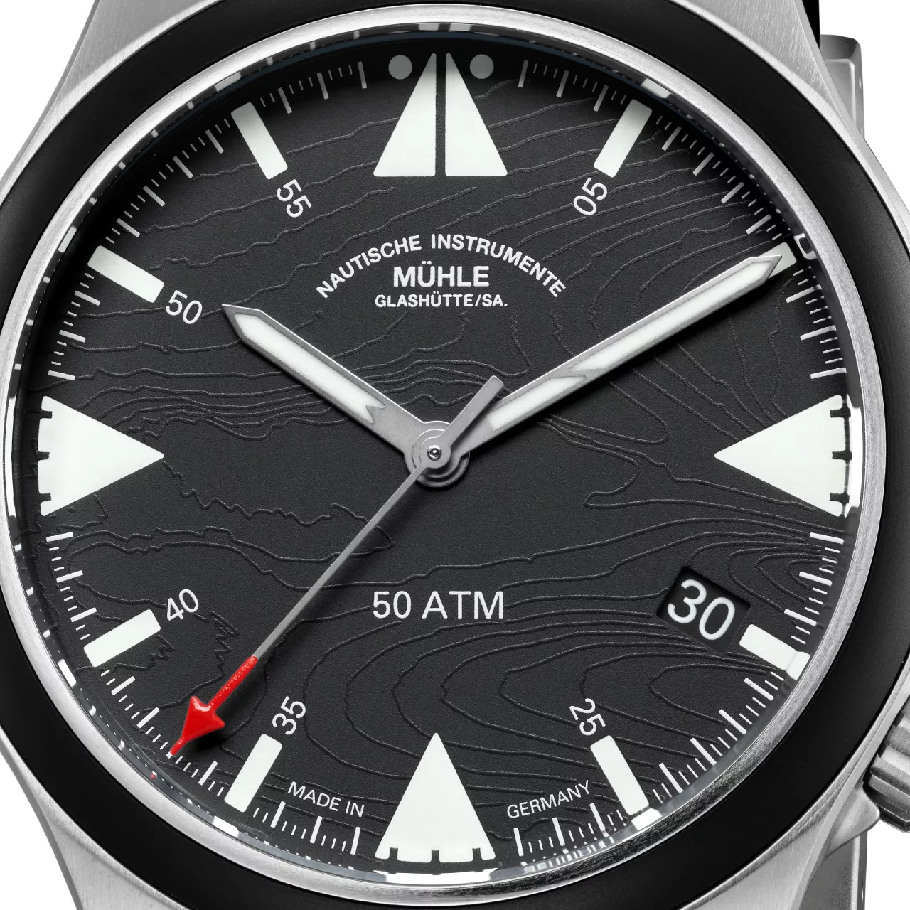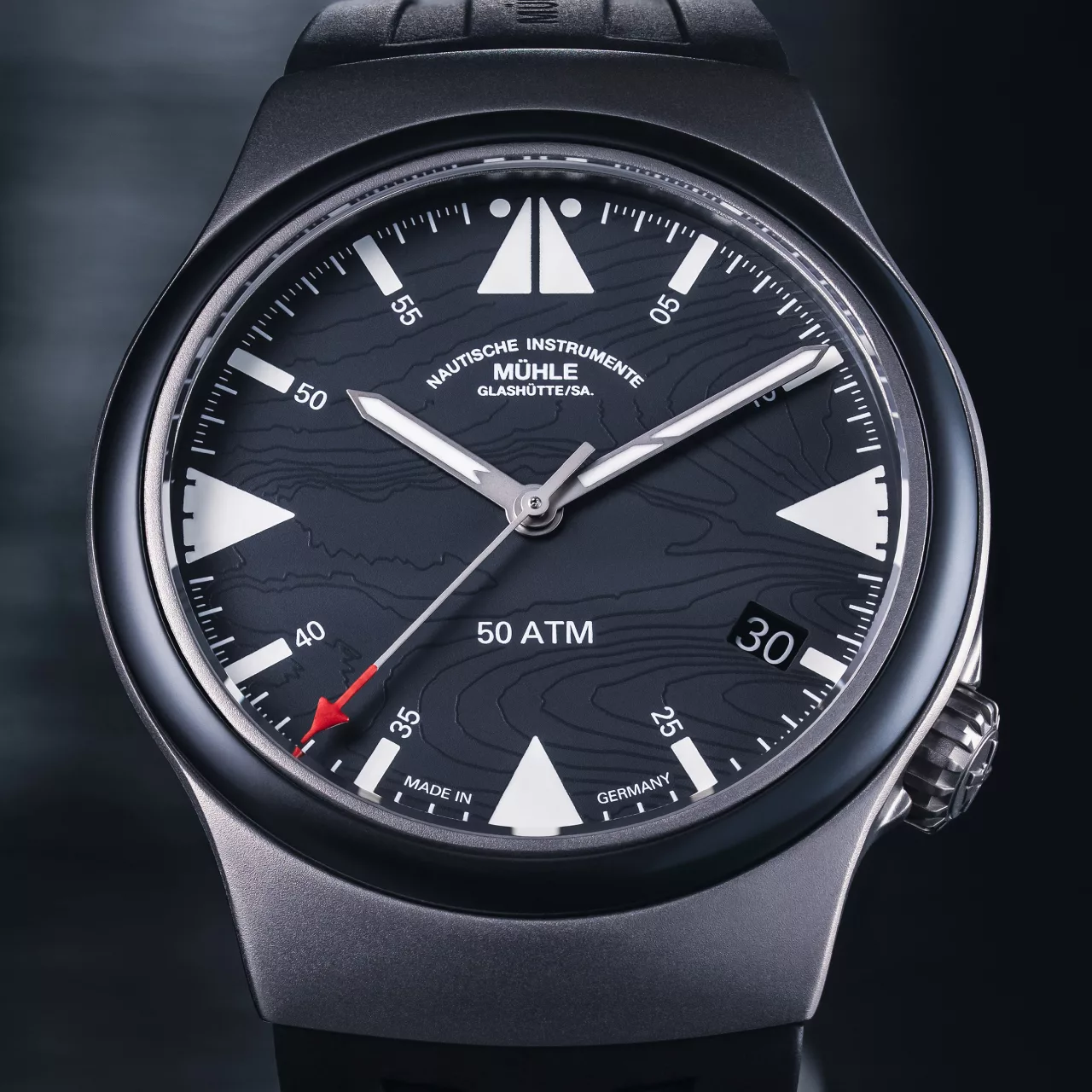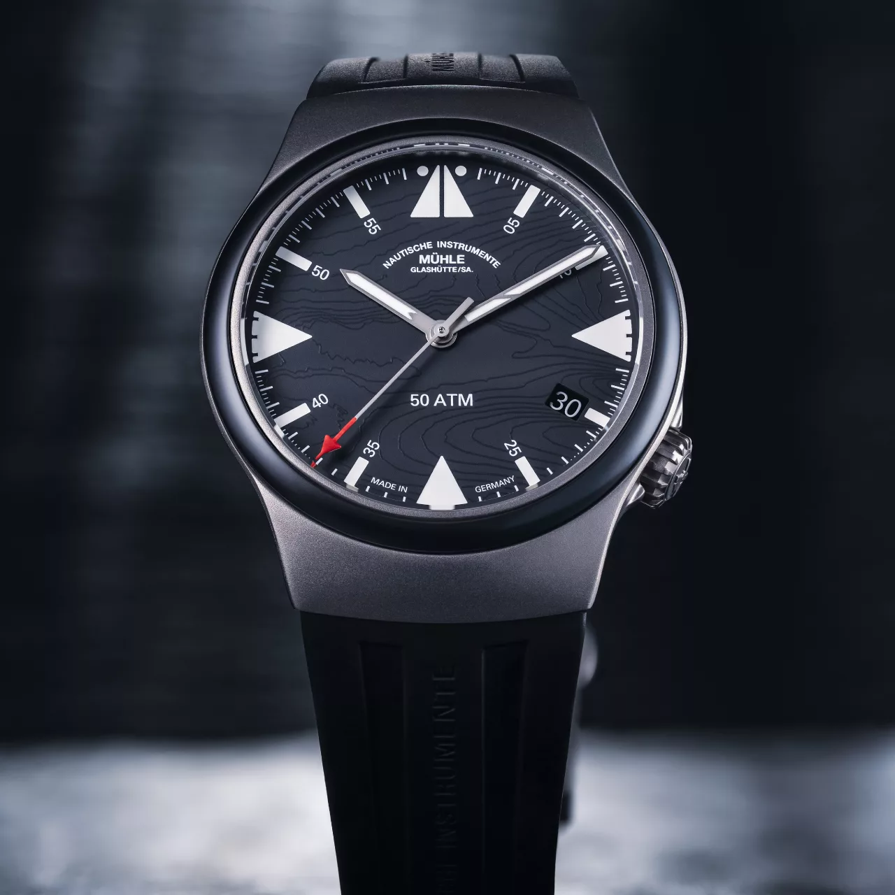 The titanium grey dial is styled with functional clarity in mind. It incorporates a fine line pattern referencing topographical isolines of the North Sea near Bremerhaven – the headquarters of the DGzRS. Accents in red pay tribute to the DGzRS’s colour palette, visible in both the second hand and in UV-reactive markers. By day, the indices are white, glowing navy blue in the dark, and showing hints of red under UV light.