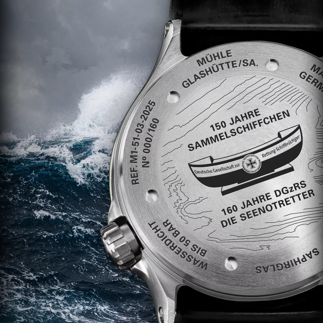 To commemorate 160 years of the German Maritime Search and Rescue Service (DGzRS) and 150 years of their iconic boat-shaped collection boxes, Mühle-Glashütte presents a limited-edition timepiece: the S.A.R. Mission-Timer “160 Years DGzRS”. This special release not only honours a legacy of maritime rescue but also directly supports the cause, with €100 from each sale donated to the DGzRS. Limited to just 160 pieces, each watch is engraved with a unique edition number and features details that tie deeply into the history of German sea rescue.