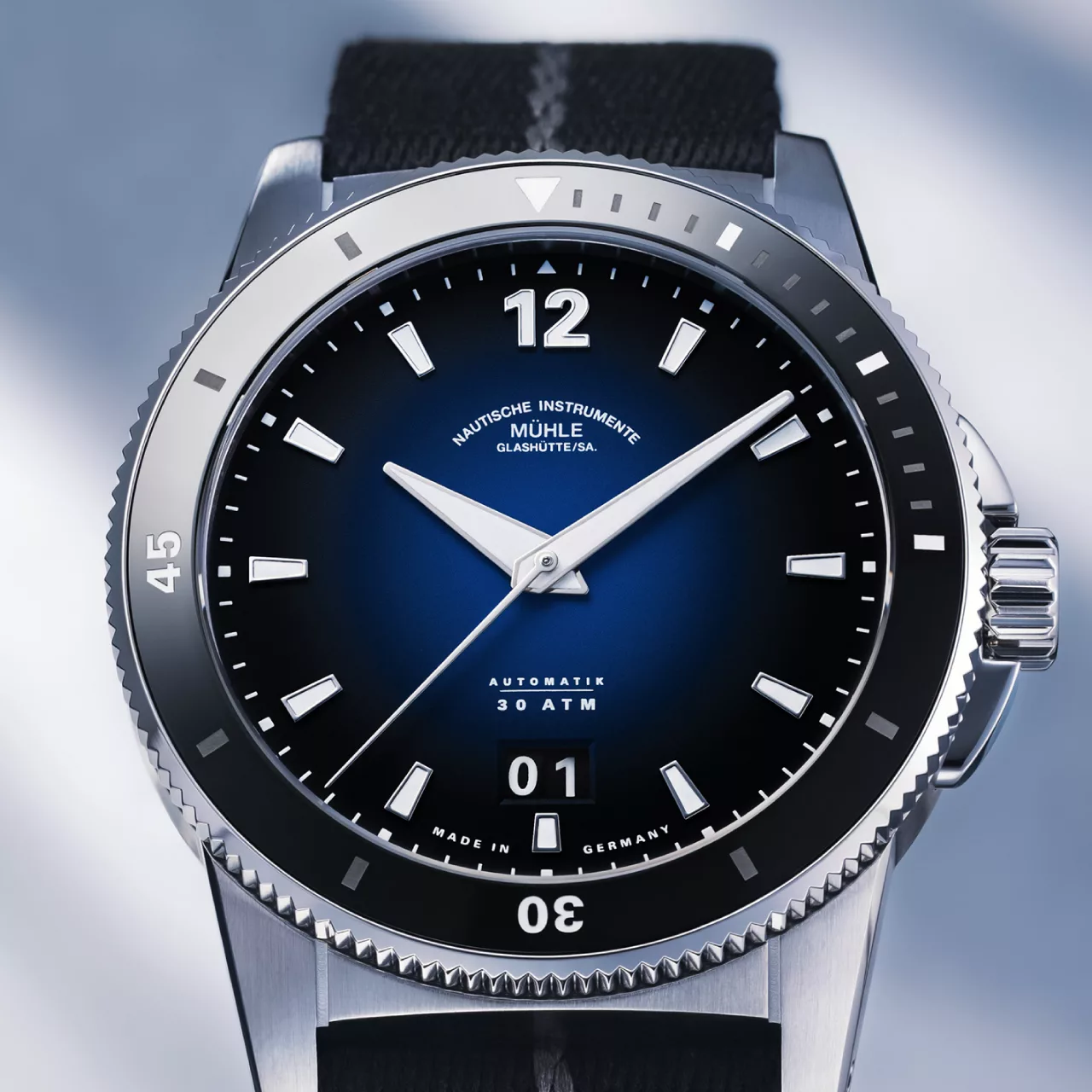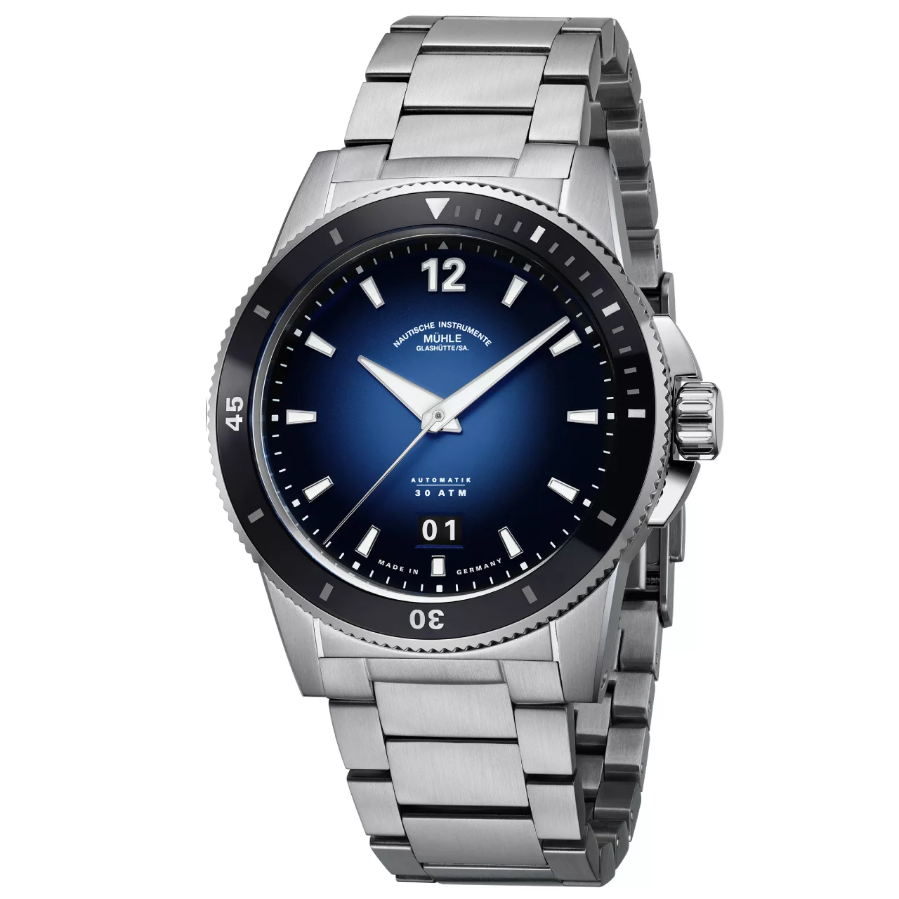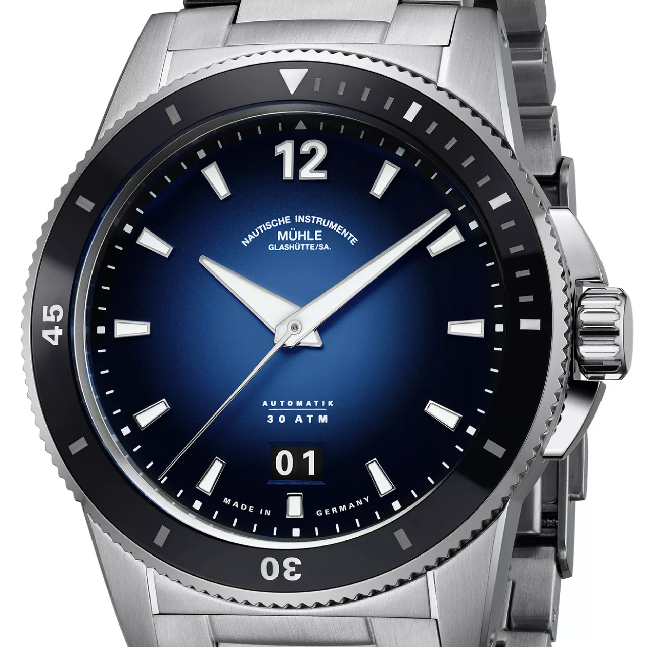The Mühle-Glashütte Sportivo Big Date Blue marks a significant chapter in the Glashütte manufacturer’s history, celebrating three decades of wristwatch production with a distinctive, technically focused sports watch. Framed by a robust 42.5 mm stainless steel case, this model introduces a striking blue-to-black gradient dial that lends the watch a subtle, almost mystical visual depth while maintaining the brand’s signature nautical instrument clarity. Its bold aesthetic is paired with purposeful functionality, ensuring the watch remains as legible as it is visually compelling.