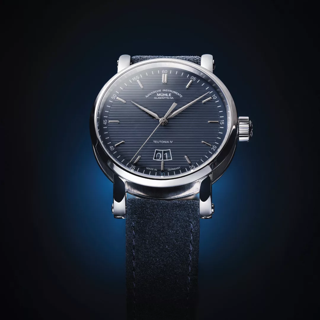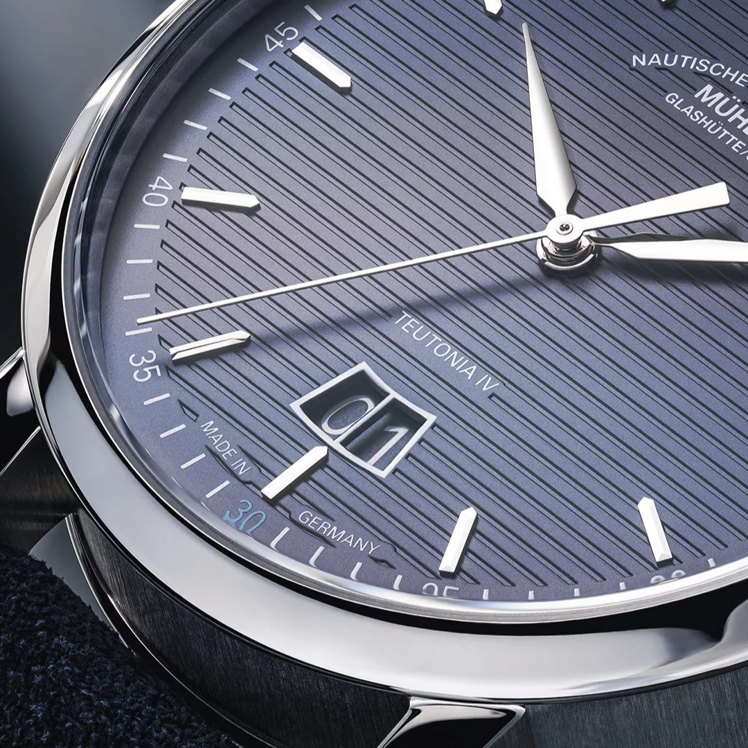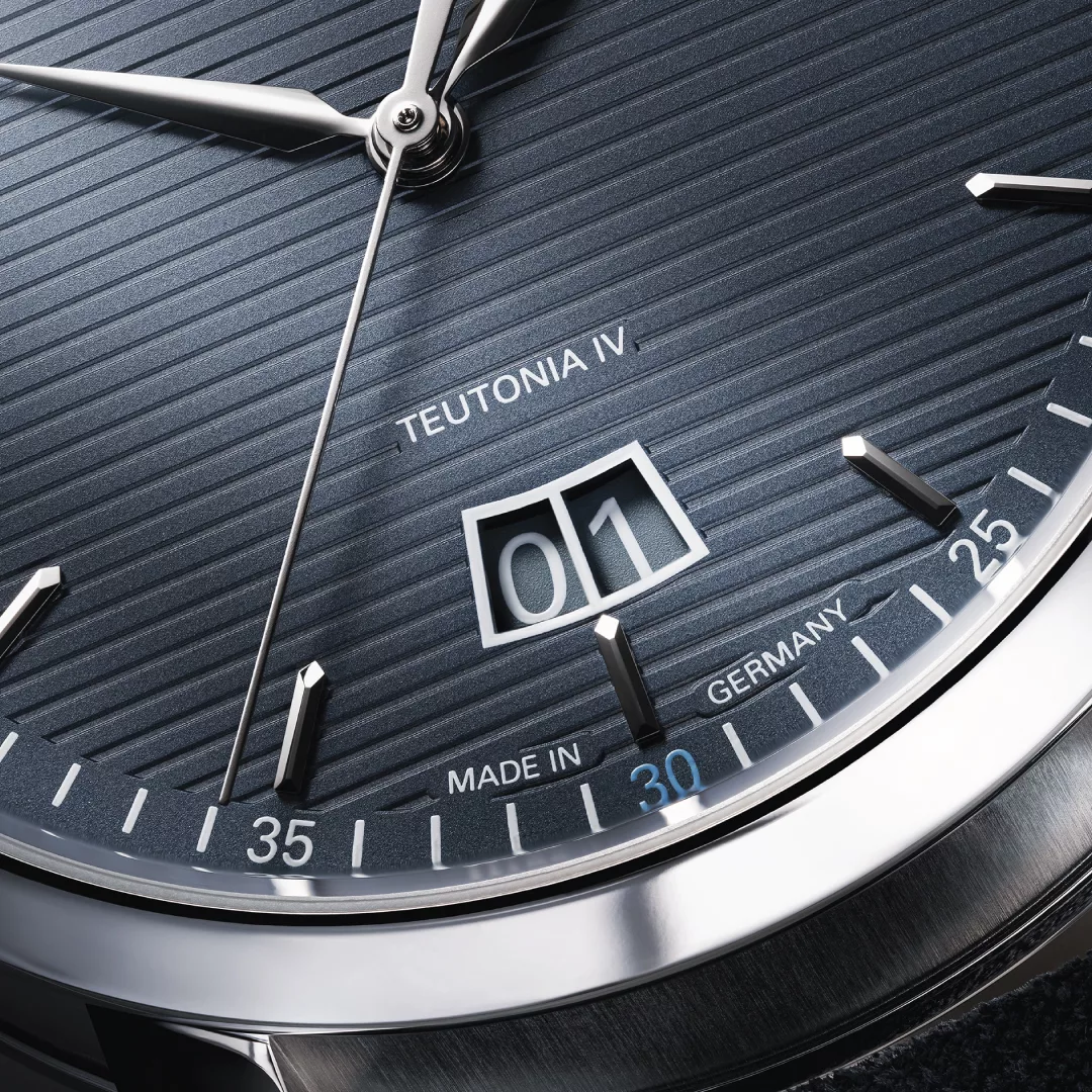 This unusual position is not the only standout feature of the new models: instead of a small second display, they have a second hand extending from the centre of the dial to complement the straightforward and modern aesthetics of the Teutonia IV. The particularly easy-to-read big date display therefore forms the perfect background for not two, but three fine hands with a bright nickel-plated finish. With their perfectly coordinated lengths and proportions, these lance-shaped hands reveal the time on the clearly marked minute graduation with small second/minute numerals. The models pay tribute to Mühle’s double anniversary by highlighting the minute numeral 30 in bright Mühle anniversary blue and replacing 55 with 155.