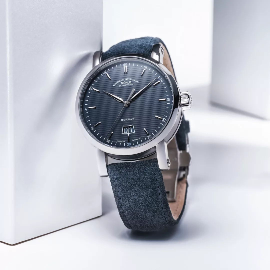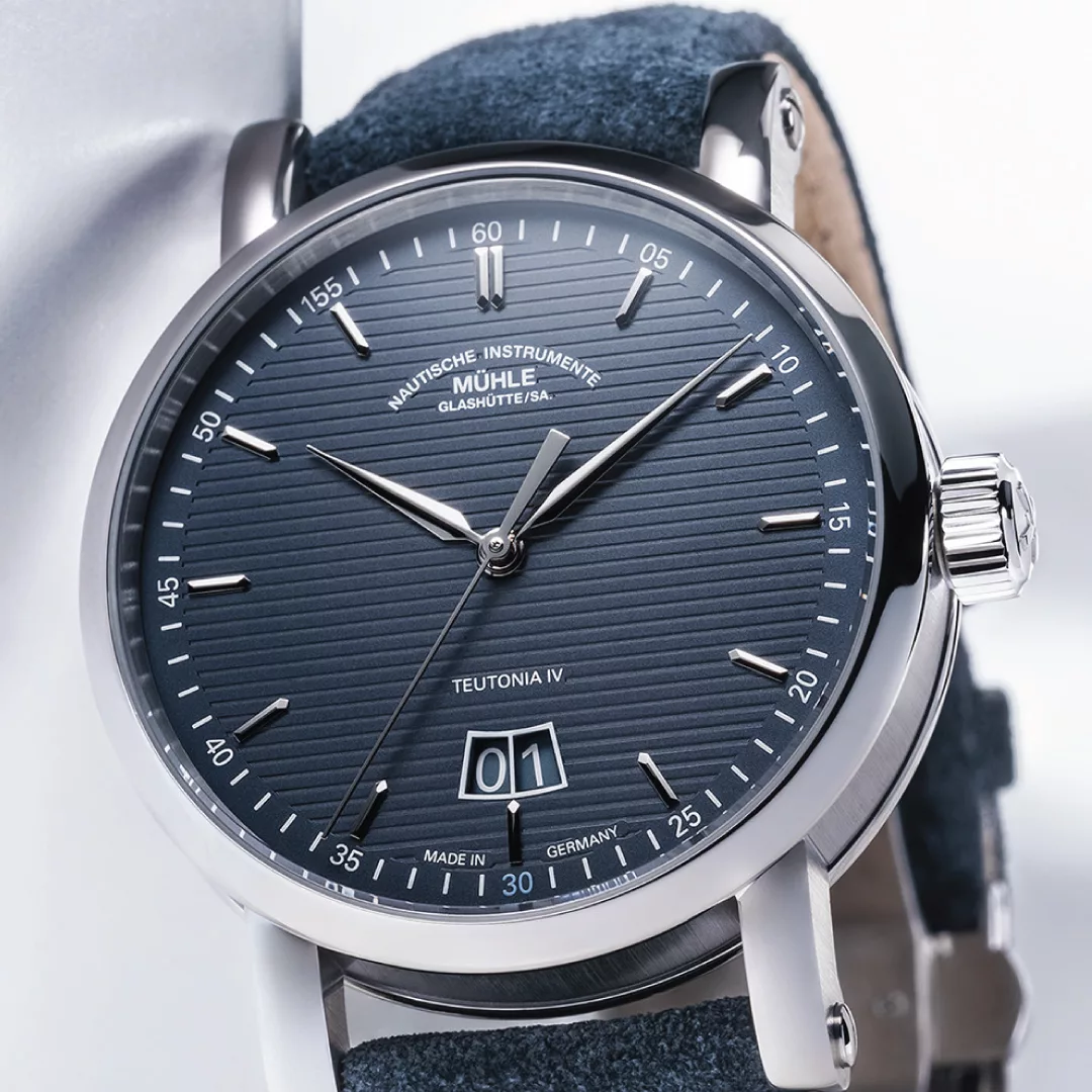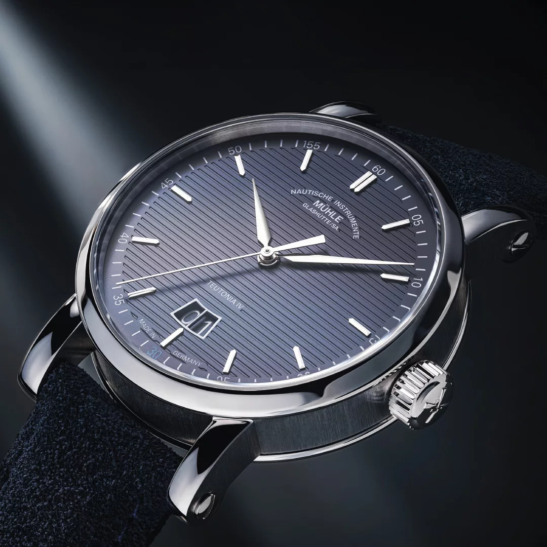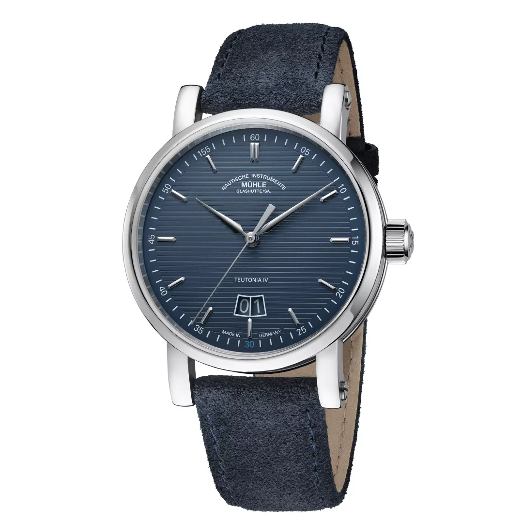 This unusual position is not the only standout feature of the new models: instead of a small second display, they have a second hand extending from the centre of the dial to complement the straightforward and modern aesthetics of the Teutonia IV. The particularly easy-to-read big date display therefore forms the perfect background for not two, but three fine hands with a bright nickel-plated finish. With their perfectly coordinated lengths and proportions, these lance-shaped hands reveal the time on the clearly marked minute graduation with small second/minute numerals. The models pay tribute to Mühle’s double anniversary by highlighting the minute numeral 30 in bright Mühle anniversary blue and replacing 55 with 155.