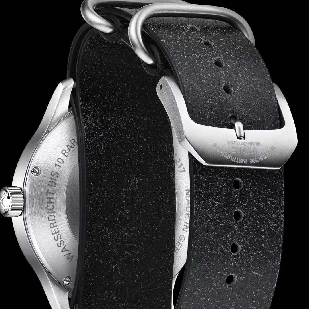 Band: Leather NATO-style strap with a stainless steel pin buckle.