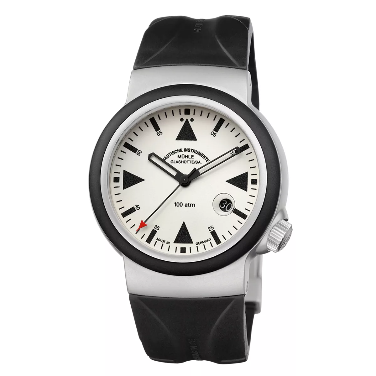Case: Stainless steel with rubber bezel. 4 mm thick sapphire crystal with internally ground loupe. Screw-in crown.