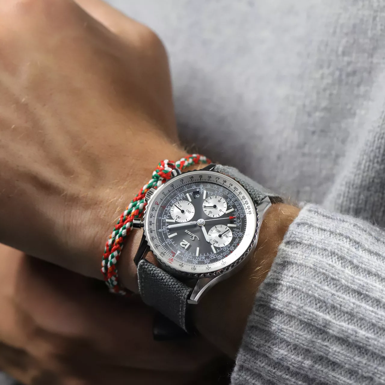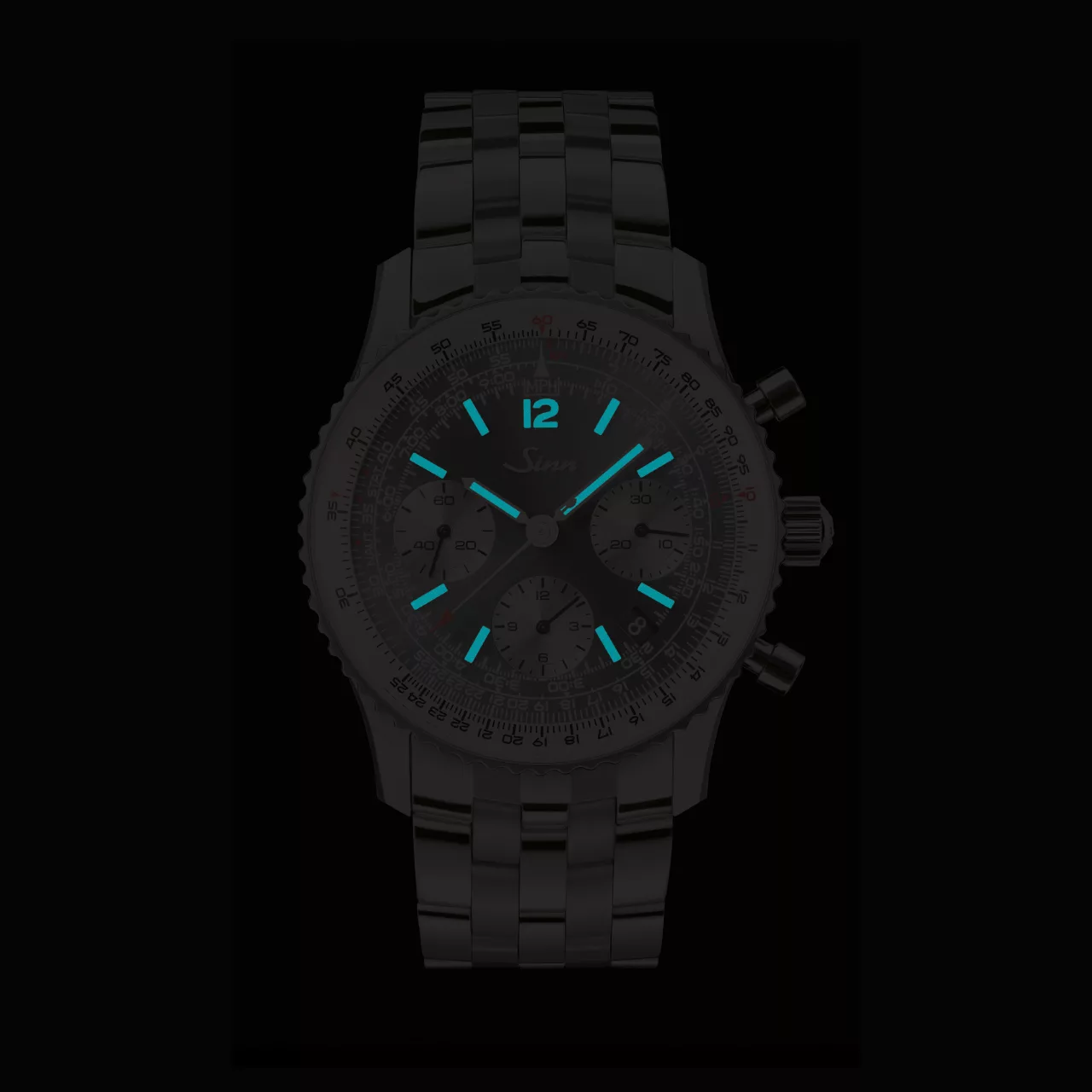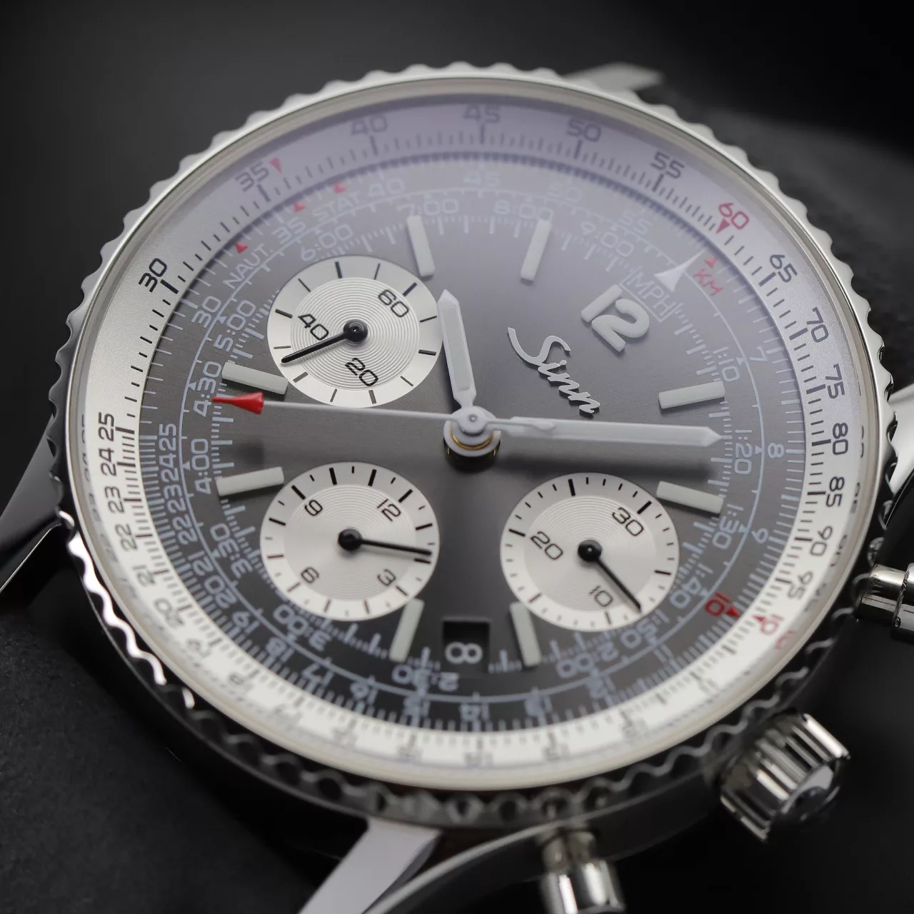 Engineering precision is most evident in the directly operable rotating bezel. Thanks to Sinn’s proprietary DSP Technology, the bezel achieves dynamic sealing up to 20 bar while remaining smoothly adjustable from the outer diameter. Achieving this level of water resistance in a chronograph with a slide-rule function demonstrates decades of accumulated expertise in functional case construction.