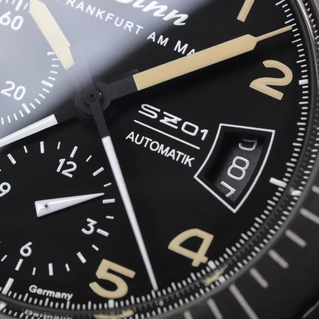 The modern, innovative character of the 156.1 E is reflected in Sinn’s in-house chronograph movement SZ01, featuring a 60-minute stopwatch hand from the dial centre. The advantage is that stop times can be recorded more easily, quickly, and accurately—resulting in a significant improvement in readability. This movement is integrated into a newly designed case with a screw-in back, aesthetically modelled after its historical predecessors with a 43mm diameter sliding case. However, the 156.1 E model now features a sapphire crystal cover glass, which is more scratch-resistant than the acrylic glass used in the original model. The pilot’s bezel is captively connected to the case and can be smoothly rotated without detent—an innovation being introduced to the SINN range for the first time with the 156.1 model. The TEGIMENT Technology of the pilot’s bezel is also an essential prerequisite for applying the Hard Coating in anthracite, ensuring exceptional durability.