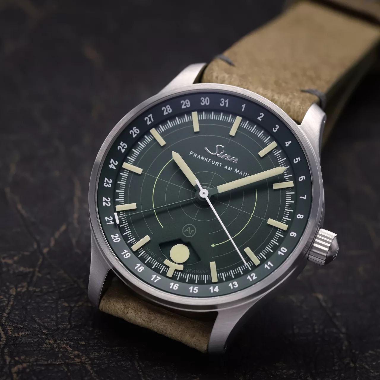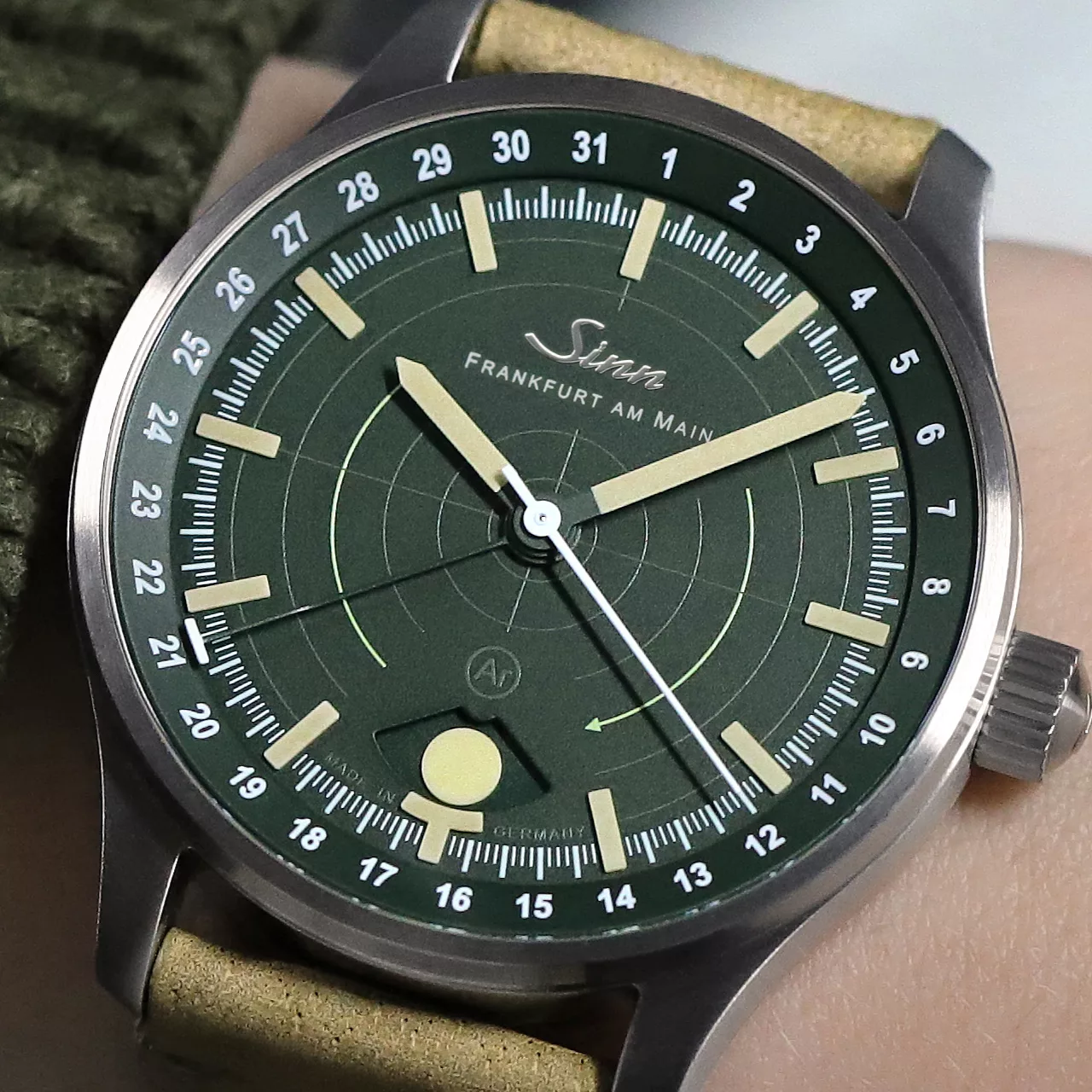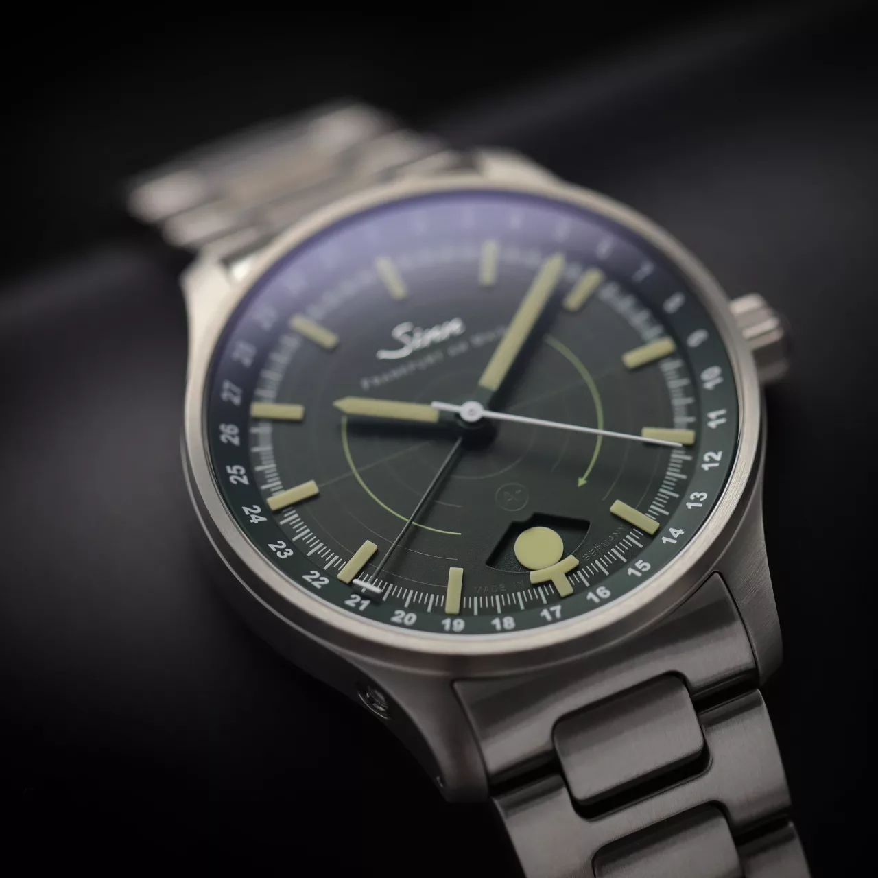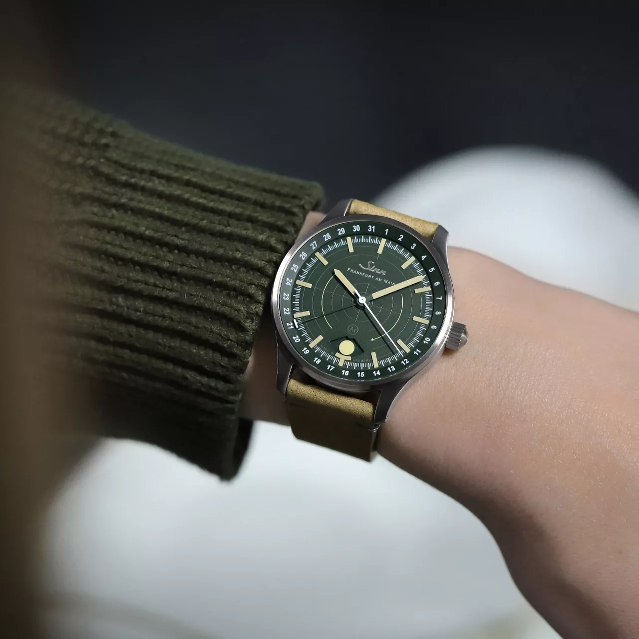 Legibility in darkness is another area where the 308 Hunting Watch stands apart. The moonlight display and the applied indices both use hybrid ceramic luminous elements, attached by hand. By integrating luminous pigments directly into the hybrid ceramic components, Sinn achieves an especially high concentration of illuminant. The result is strong luminous performance and excellent readability in low-light conditions, while also giving the dial a more sculptural, technical appearance. Against the dark green dial, these elements create a distinctive visual depth that feels refined without losing its instrument-like clarity.