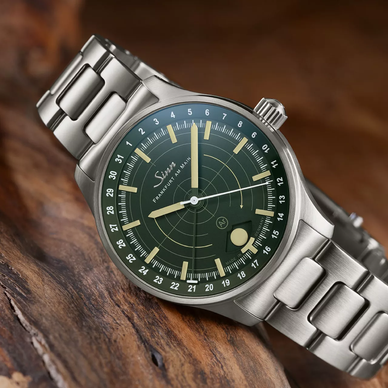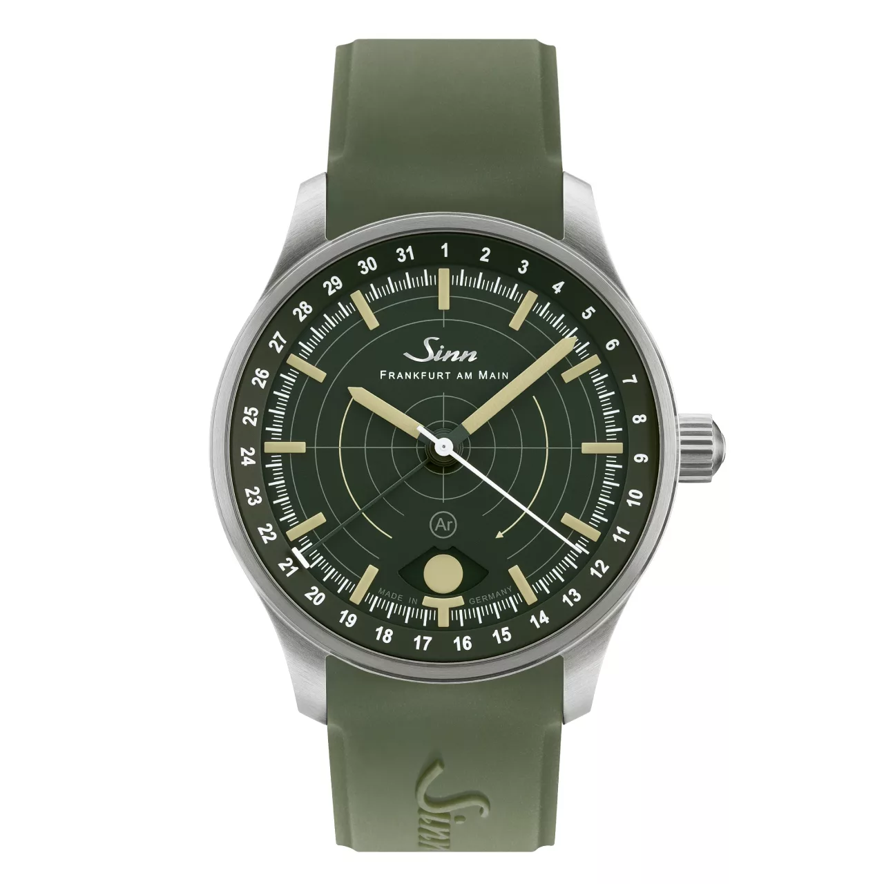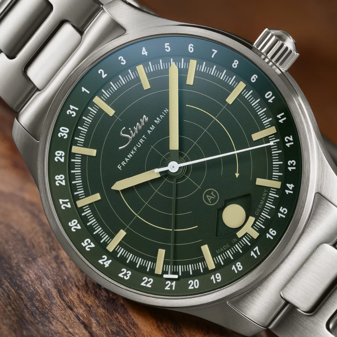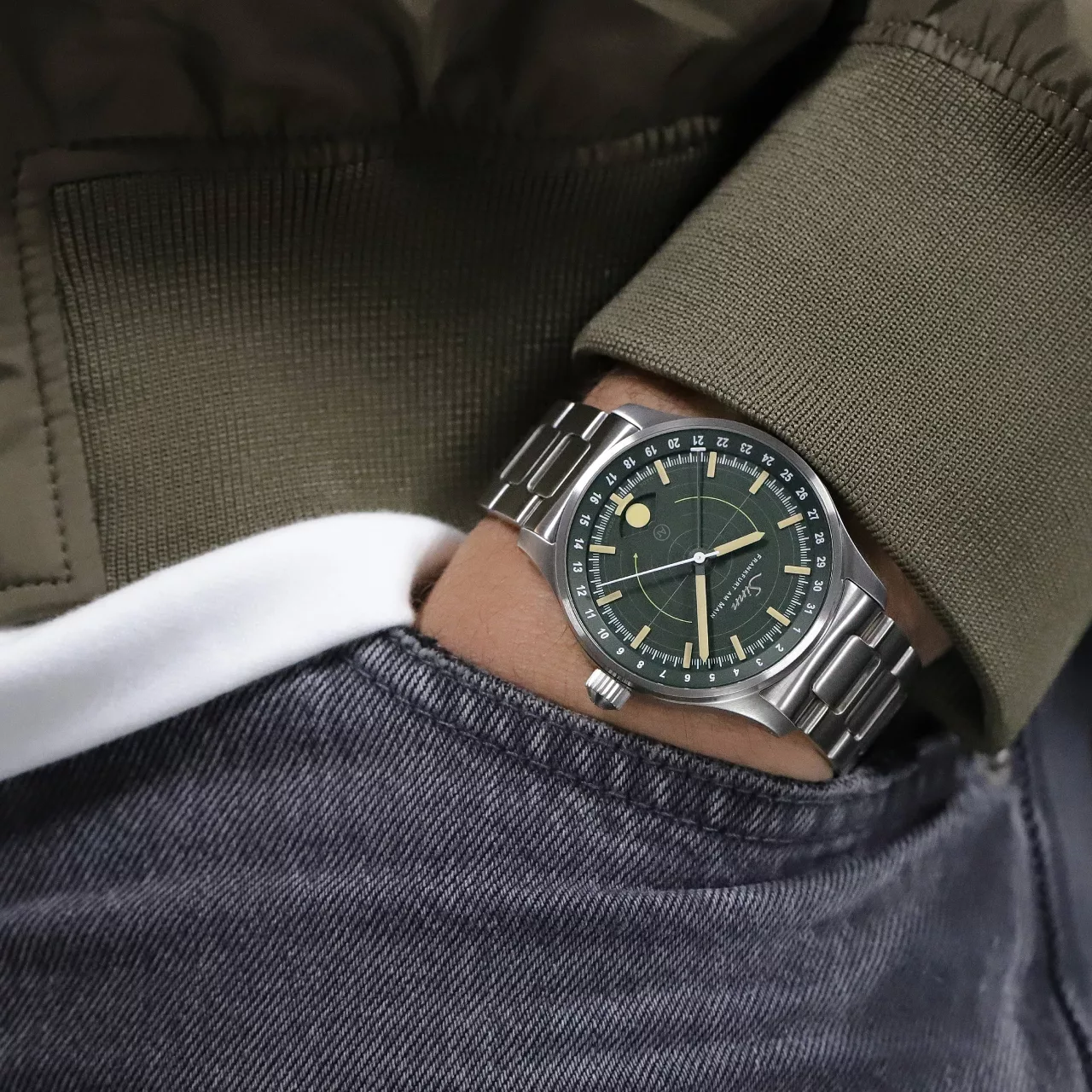 Legibility in darkness is another area where the 308 Hunting Watch stands apart. The moonlight display and the applied indices both use hybrid ceramic luminous elements, attached by hand. By integrating luminous pigments directly into the hybrid ceramic components, Sinn achieves an especially high concentration of illuminant. The result is strong luminous performance and excellent readability in low-light conditions, while also giving the dial a more sculptural, technical appearance. Against the dark green dial, these elements create a distinctive visual depth that feels refined without losing its instrument-like clarity.