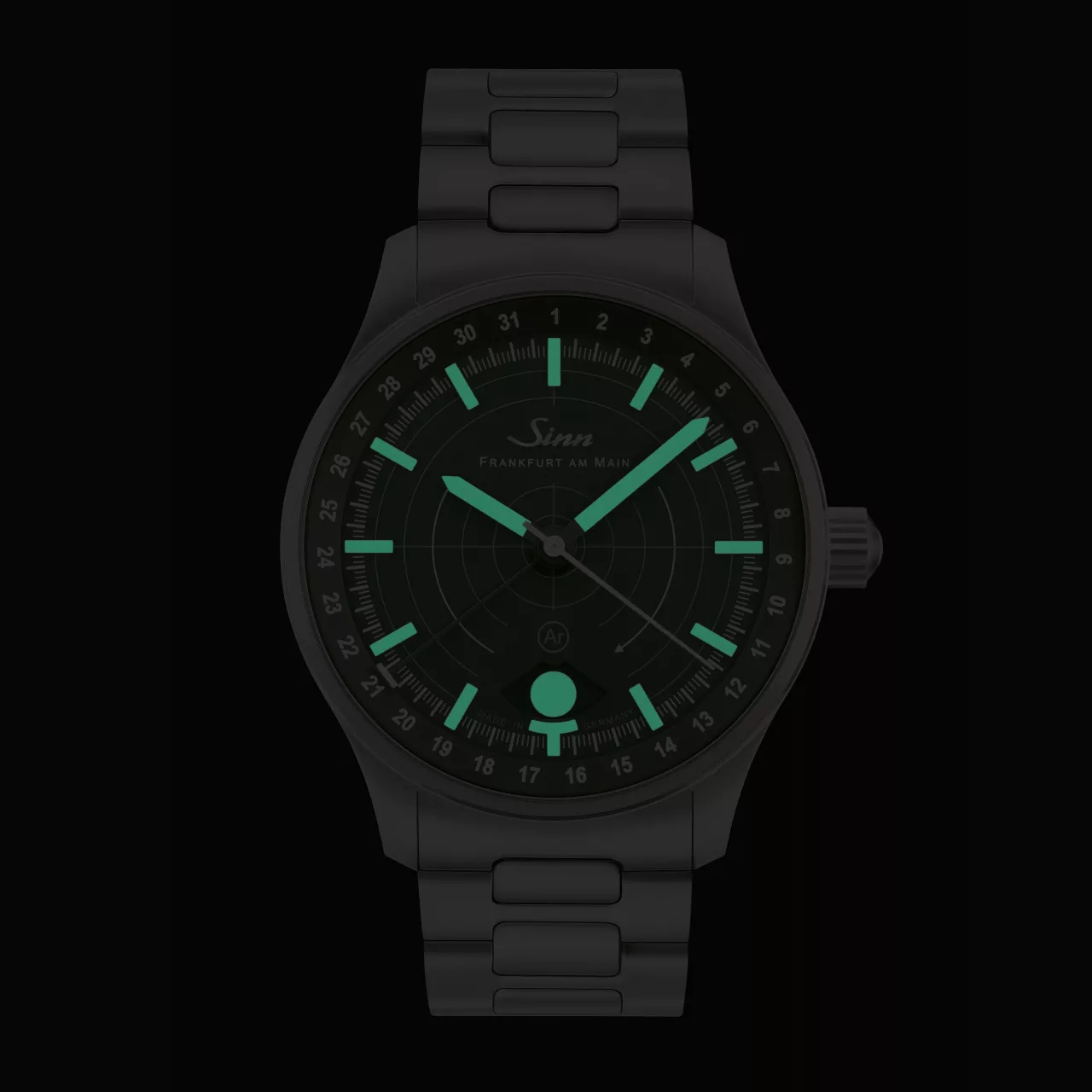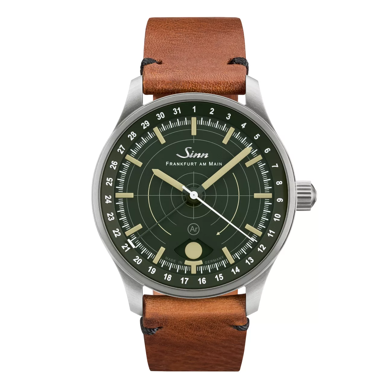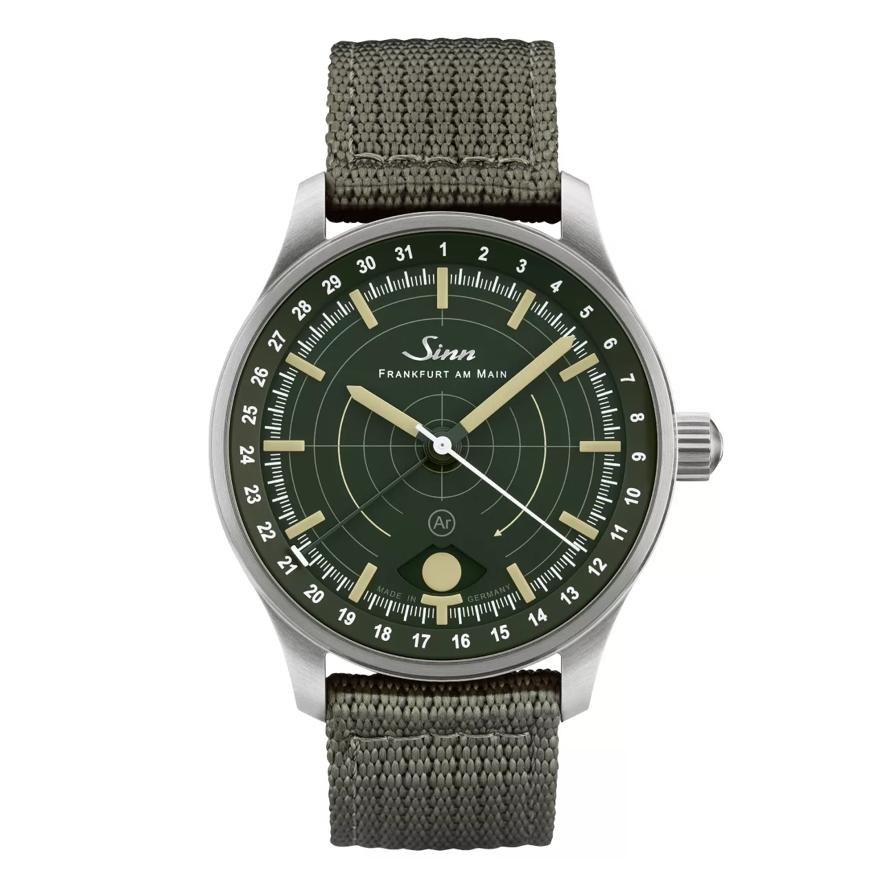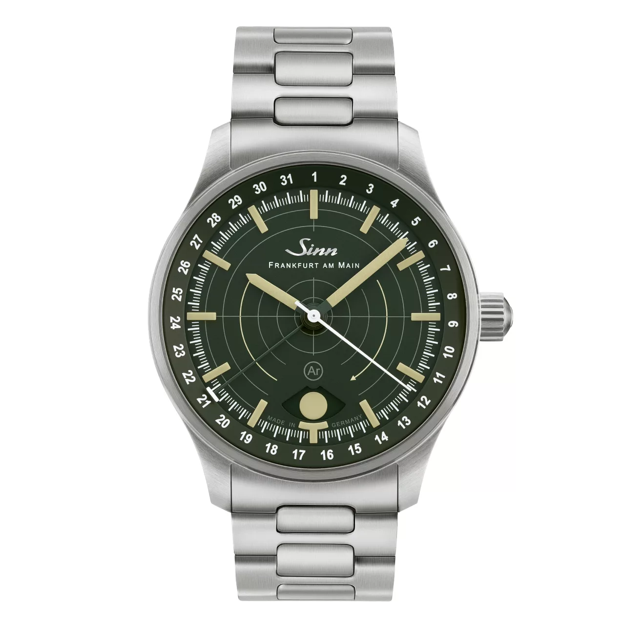 Legibility in darkness is another area where the 308 Hunting Watch stands apart. The moonlight display and the applied indices both use hybrid ceramic luminous elements, attached by hand. By integrating luminous pigments directly into the hybrid ceramic components, Sinn achieves an especially high concentration of illuminant. The result is strong luminous performance and excellent readability in low-light conditions, while also giving the dial a more sculptural, technical appearance. Against the dark green dial, these elements create a distinctive visual depth that feels refined without losing its instrument-like clarity.
