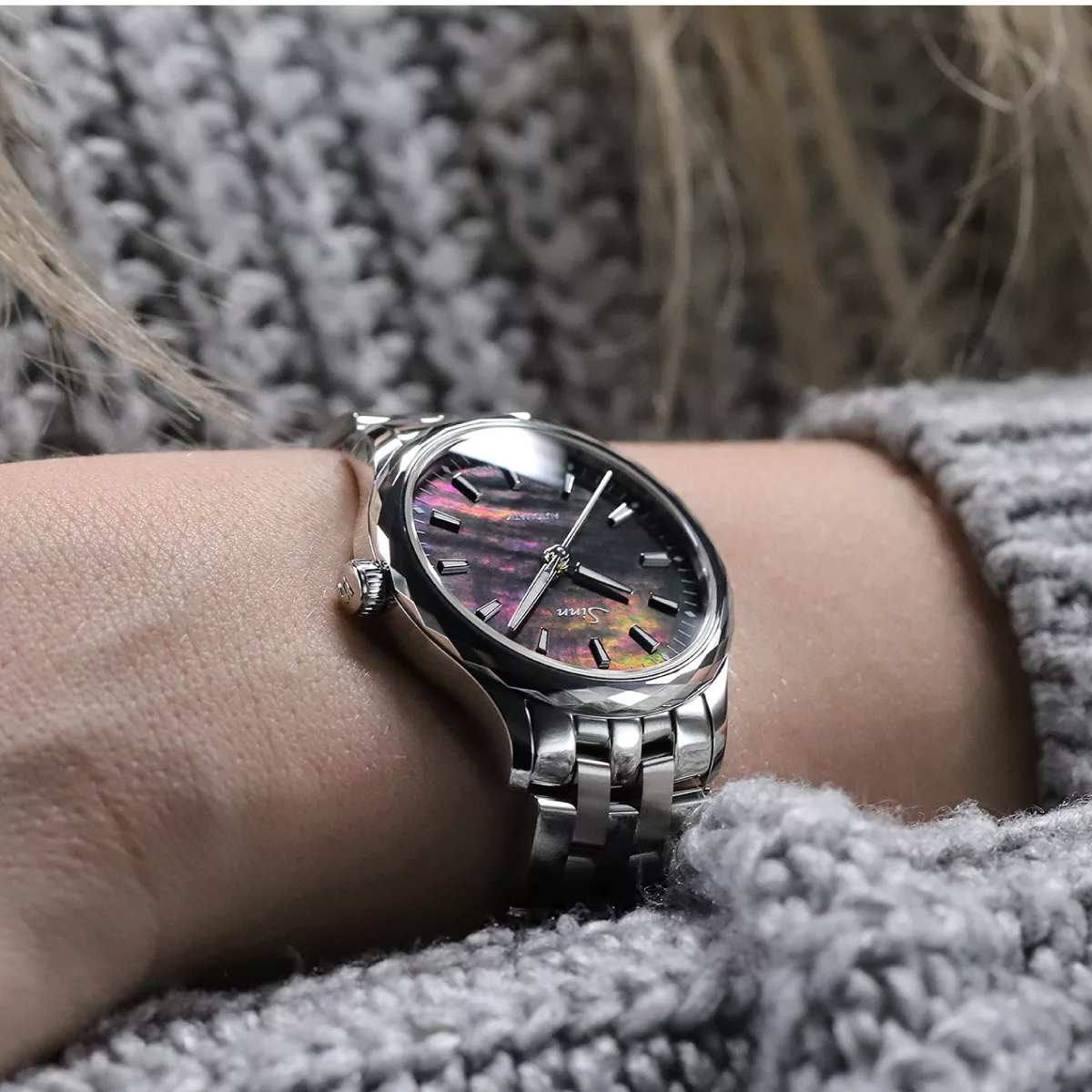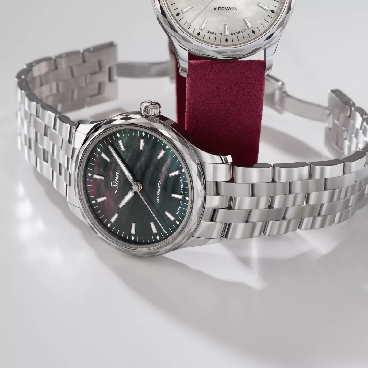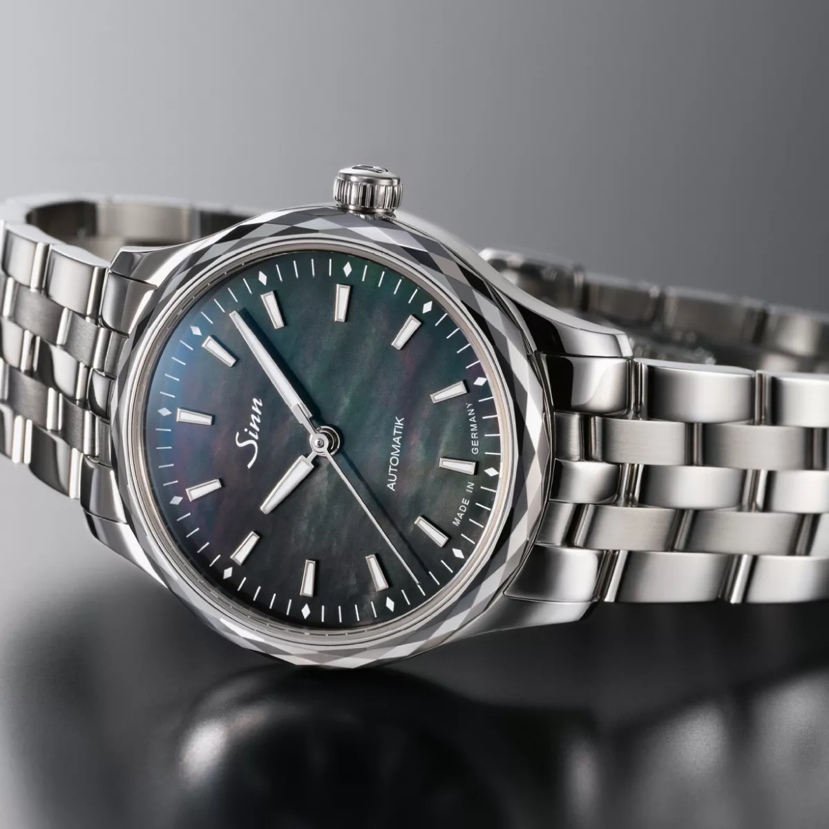 The dial, rendered in black shimmering mother‑of‑pearl, offers a striking contrast to the polished case. The hour markers reflect the same rhombus motif found on the bezel, while hand-attached appliques and luminous coatings ensure clarity even in low light. The rounded crown, subtly highlighted, directs attention toward the bezel as a central design element. The robust stainless steel case is as resilient as it is refined, marrying daily practicality with a distinct, jewellery-like allure.