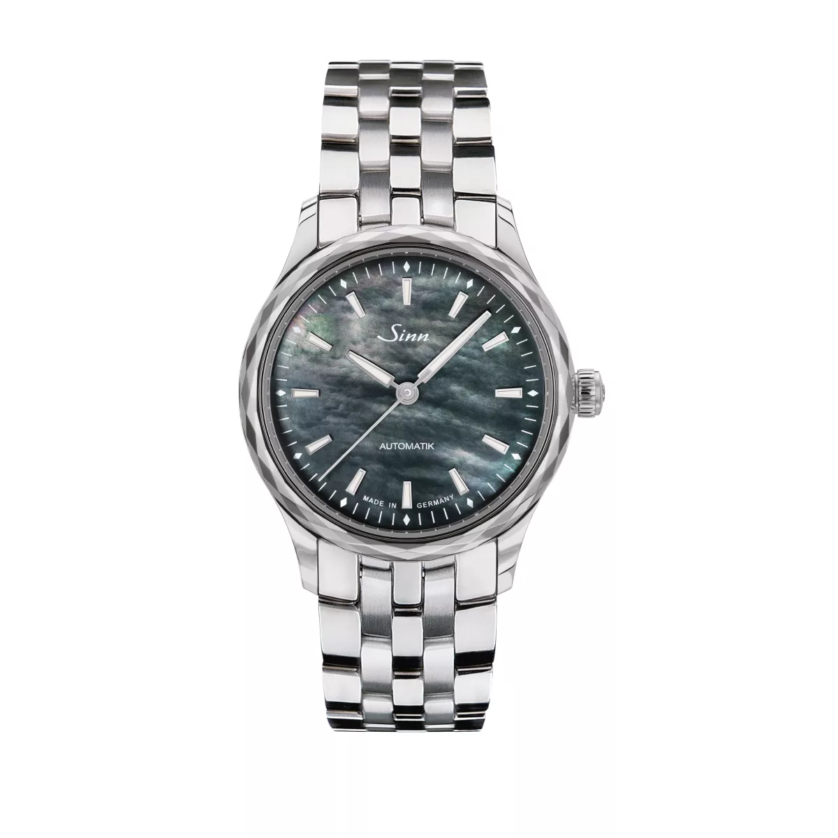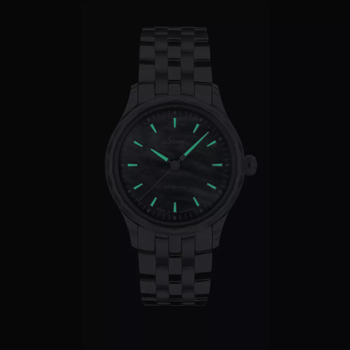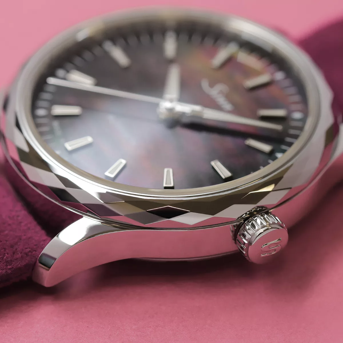 The dial, rendered in black shimmering mother‑of‑pearl, offers a striking contrast to the polished case. The hour markers reflect the same rhombus motif found on the bezel, while hand-attached appliques and luminous coatings ensure clarity even in low light. The rounded crown, subtly highlighted, directs attention toward the bezel as a central design element. The robust stainless steel case is as resilient as it is refined, marrying daily practicality with a distinct, jewellery-like allure.