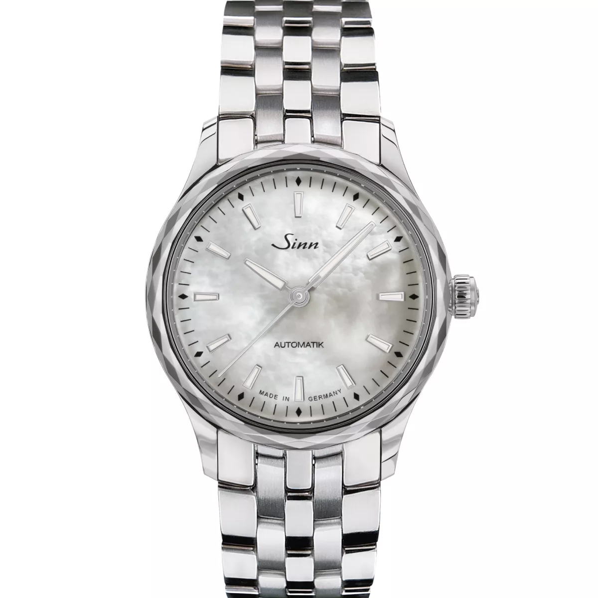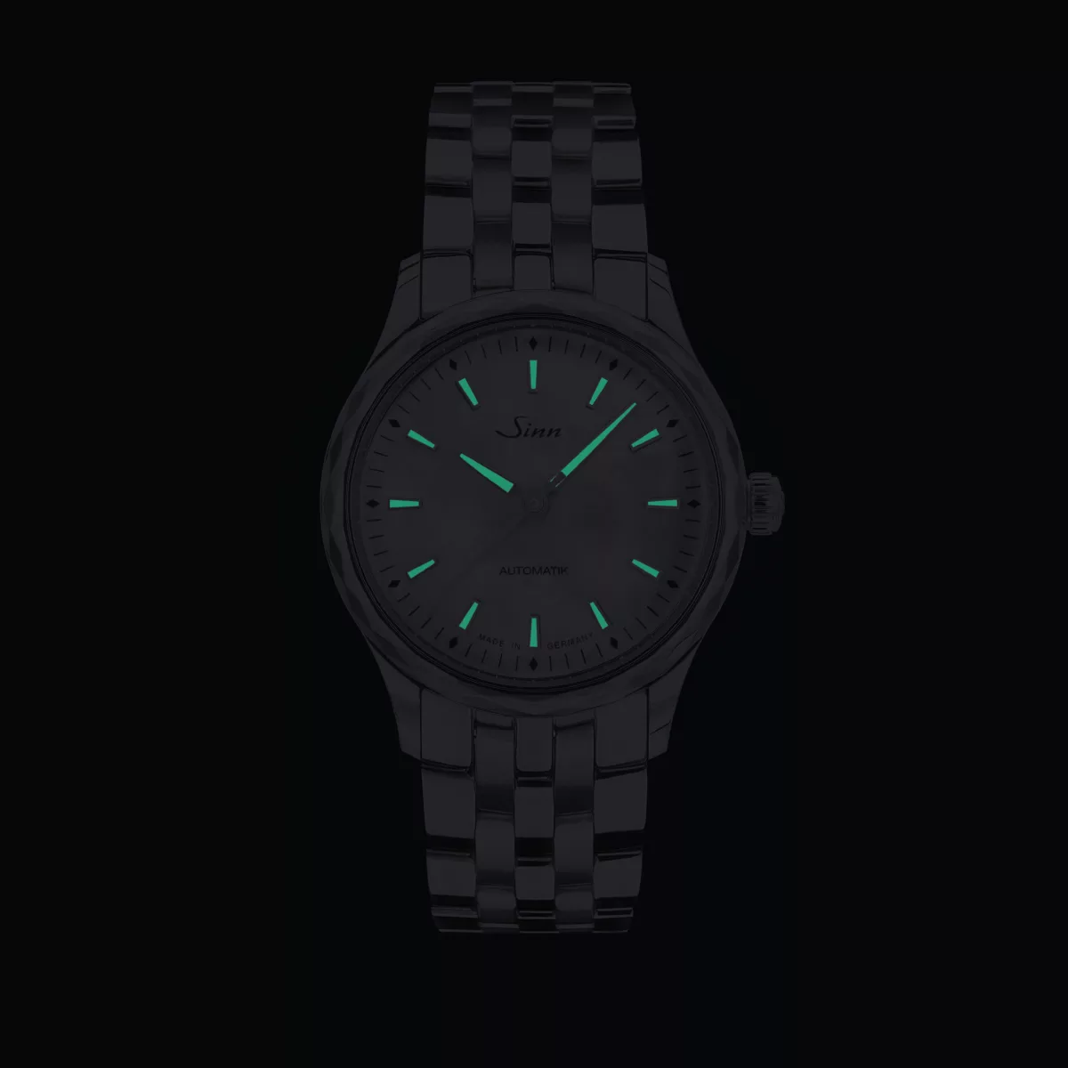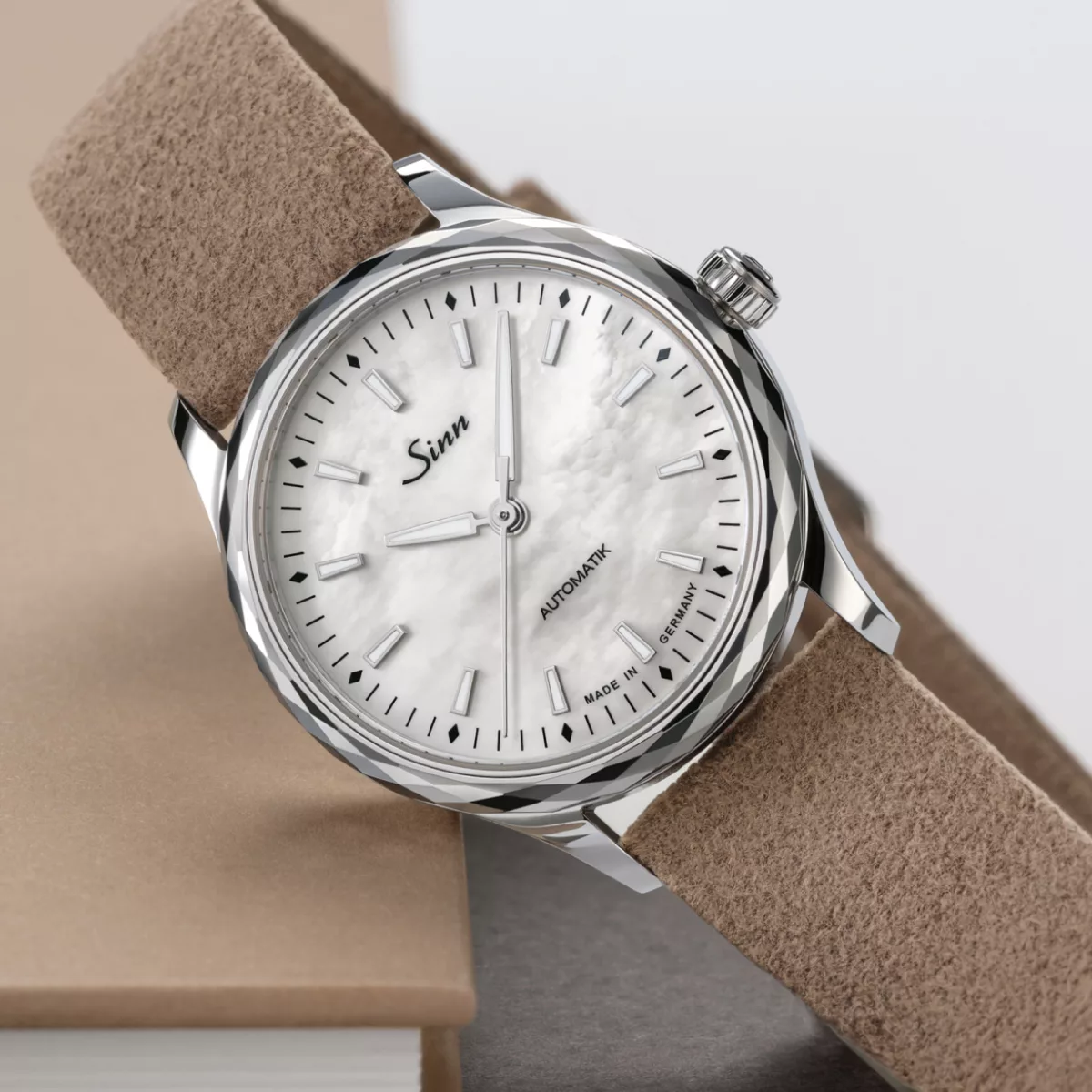 This theme is subtly reflected in the dial, where the hour markers mirror the rhombus motif of the bezel. Despite the shimmering interplay of facets, the overall aesthetic remains clean and functional. Hands and hand-attached appliques are perfectly aligned, their proportions enhancing the design’s harmonious appearance. Luminous coatings ensure optimal readability even in the dark. The rounded crown, discreetly accentuated, not only facilitates operation but also draws attention to the bezel as a central design feature. The polished stainless steel case amplifies the jewelry-like character of the watch without compromising functionality—a balance that extends to its mechanical durability, perfectly blending everyday practicality with elegant aesthetics.