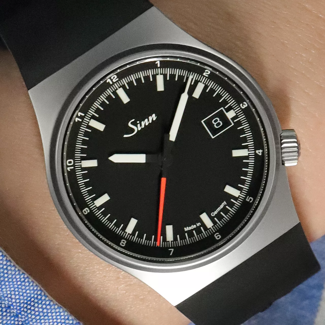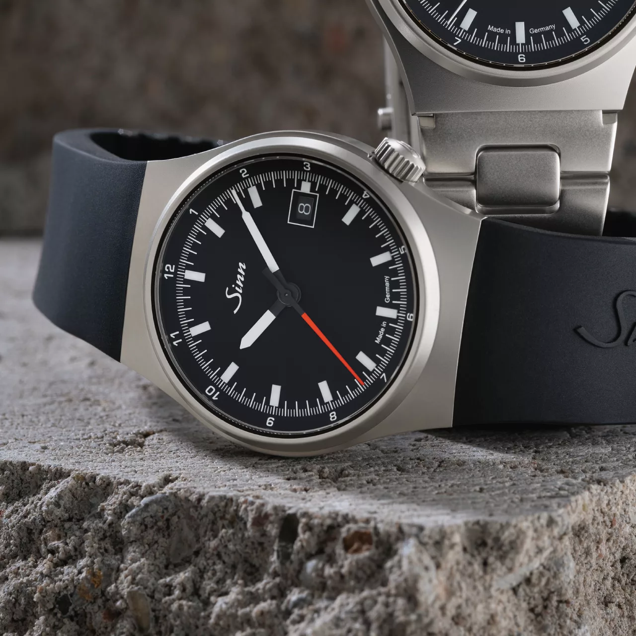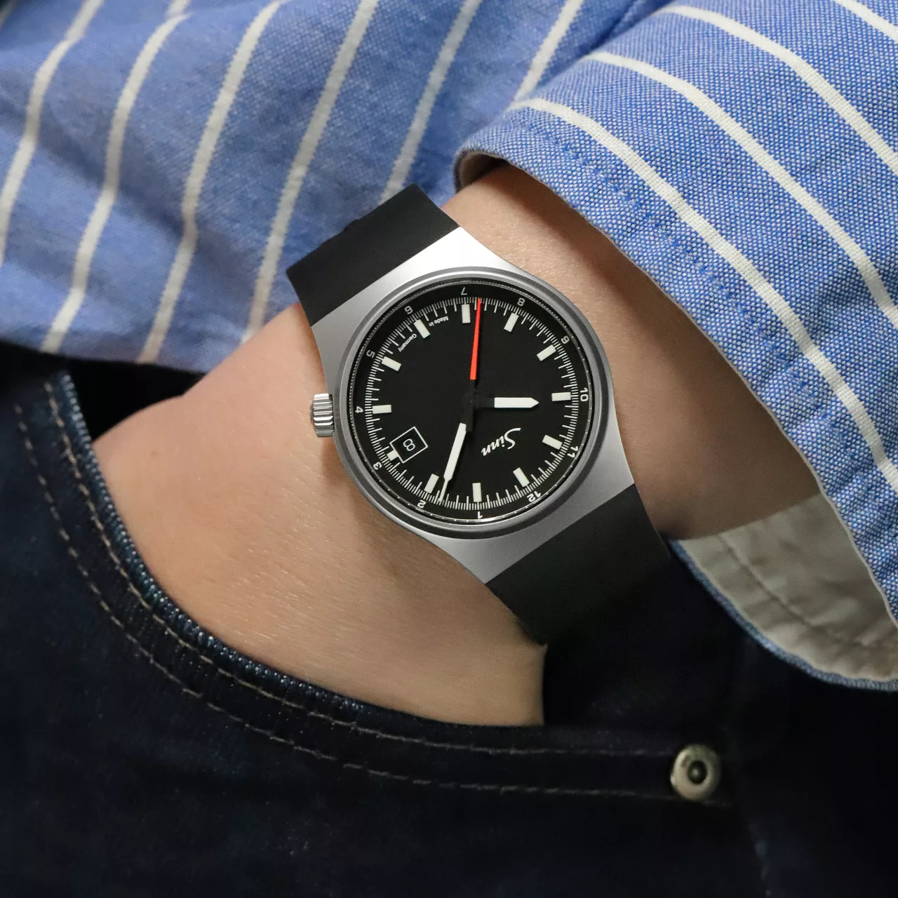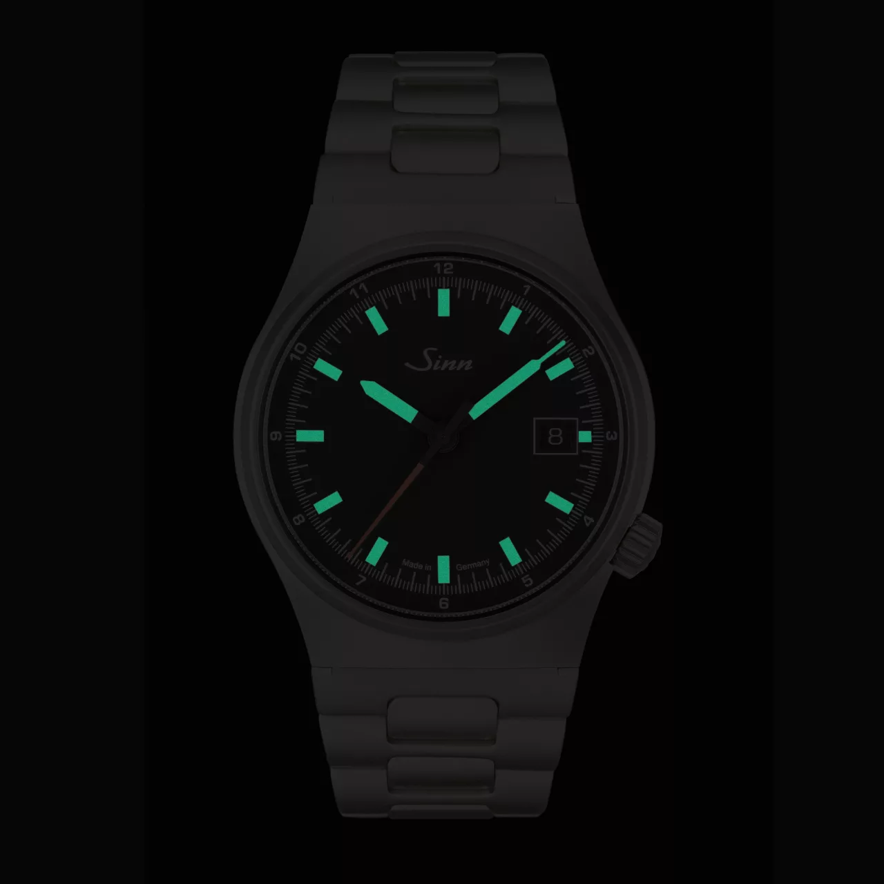 Legibility has been given equal attention. The matte black dial provides a clean backdrop for the hands and displays, while manually applied hybrid-ceramic luminous elements ensure a strong visual performance in the dark. By integrating luminous pigments directly into the ceramic component, Sinn achieves an especially high concentration of luminous material. The result is intense luminosity and crisp readability, reinforcing the technical quality of the watch in both day and night settings.