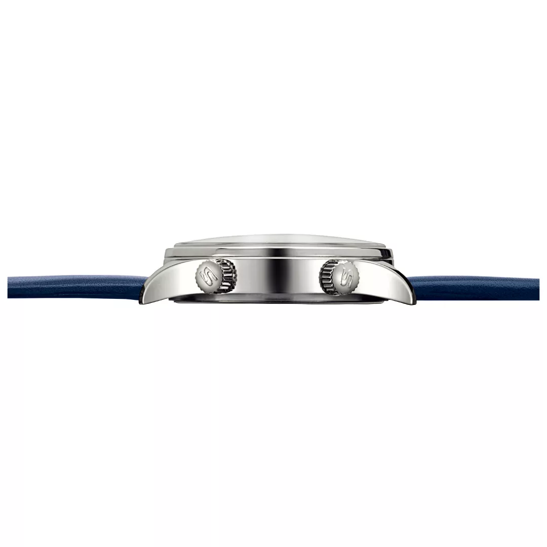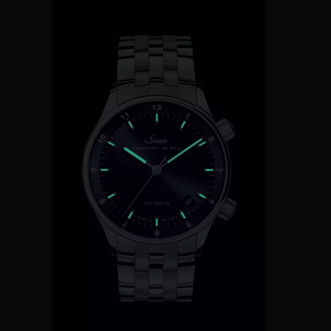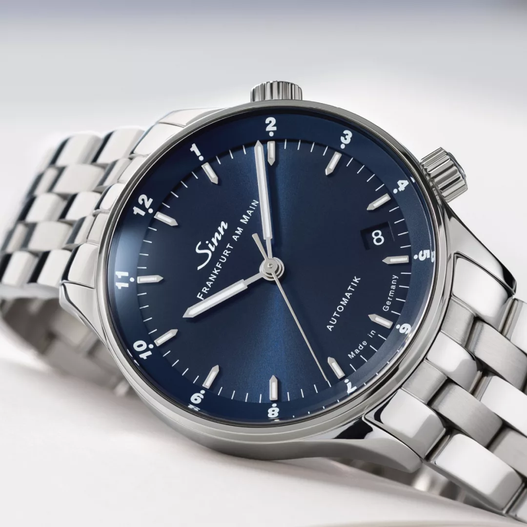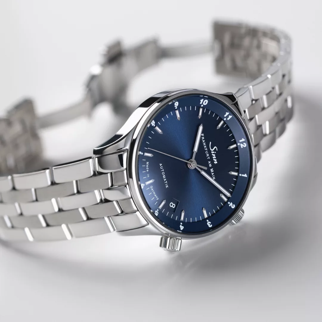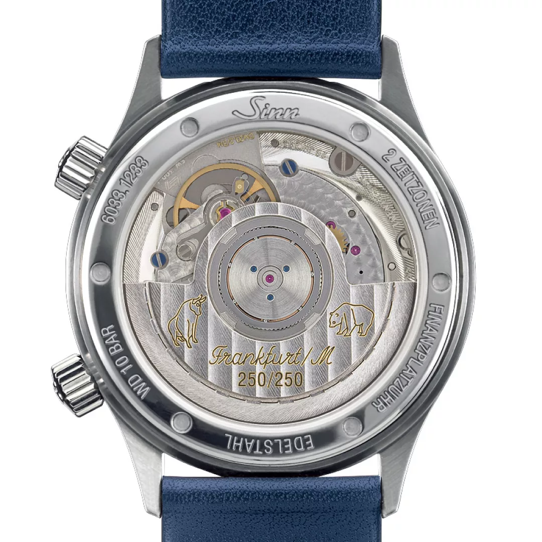 While the sapphire crystal symbolises flawless clarity, the transparent case back made of sapphire crystal provides a fascinating view of the finely finished movement, which is decorated with a limited edition number and the rotor engraving of ‘bull and bear’. The polished stainless steel case gives the watch a classic yet contemporary design, with a 34 mm diameter ensuring perfect wearing comfort and showcasing the watch to its best advantage. The silk-matt, galvanised blue dial, finished with a fine sunburst decoration, adds a unique touch. The hand-applied appliques convey understated elegance, while the display of two time zones on a 12-hour basis is useful in everyday life, allowing you to keep track of home time even when travelling. As expected from a Sinn timepiece, this elegant model is water-resistant, low pressure resistant, and pressure-resistant up to 10 bar, making it a statement of style and functionality.