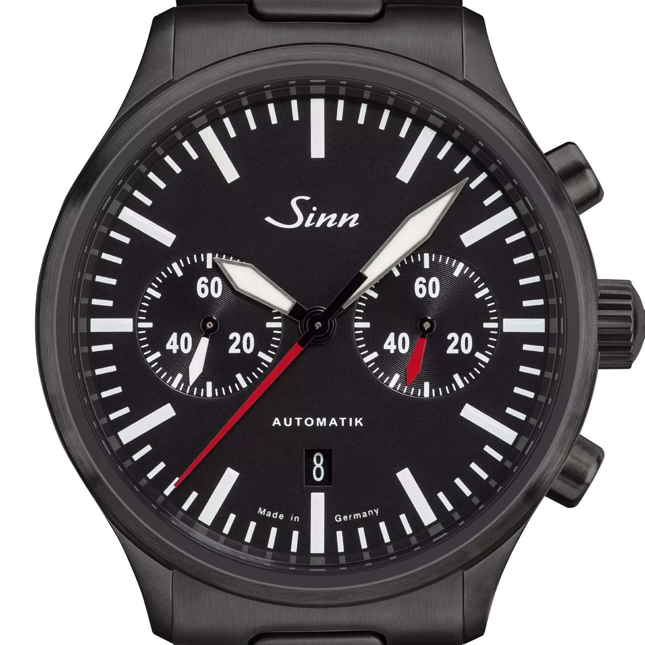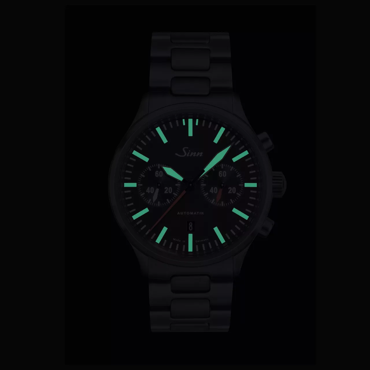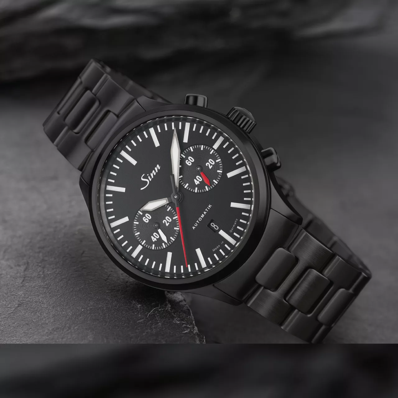 The case continues that same philosophy of durability and technical precision. Made from stainless steel with polished and satinised surfaces, it is fitted with Sinn’s black hard coating on a TEGIMENT Technology basis, enhancing surface hardness while reinforcing the watch’s bold, professional look. The overall result is a chronograph that feels robust and exacting, with a finish that underscores its role as a serious timekeeping instrument.