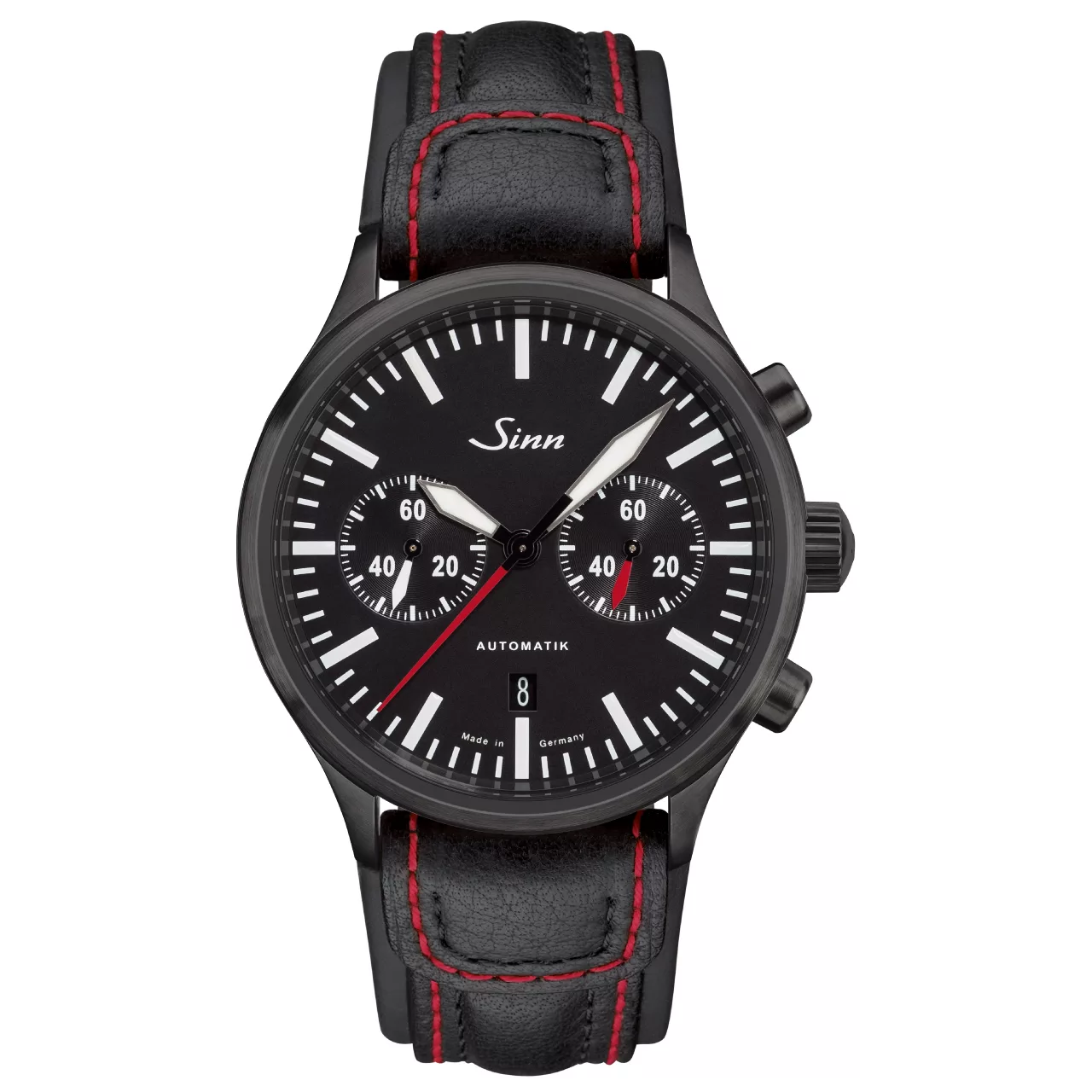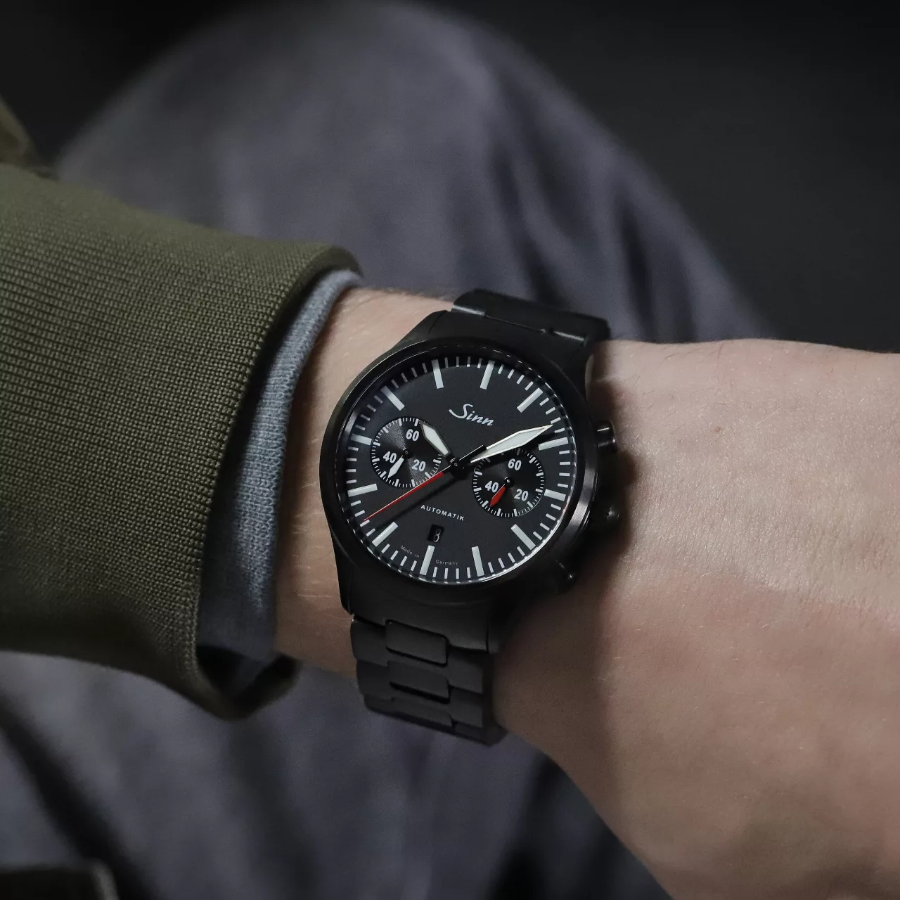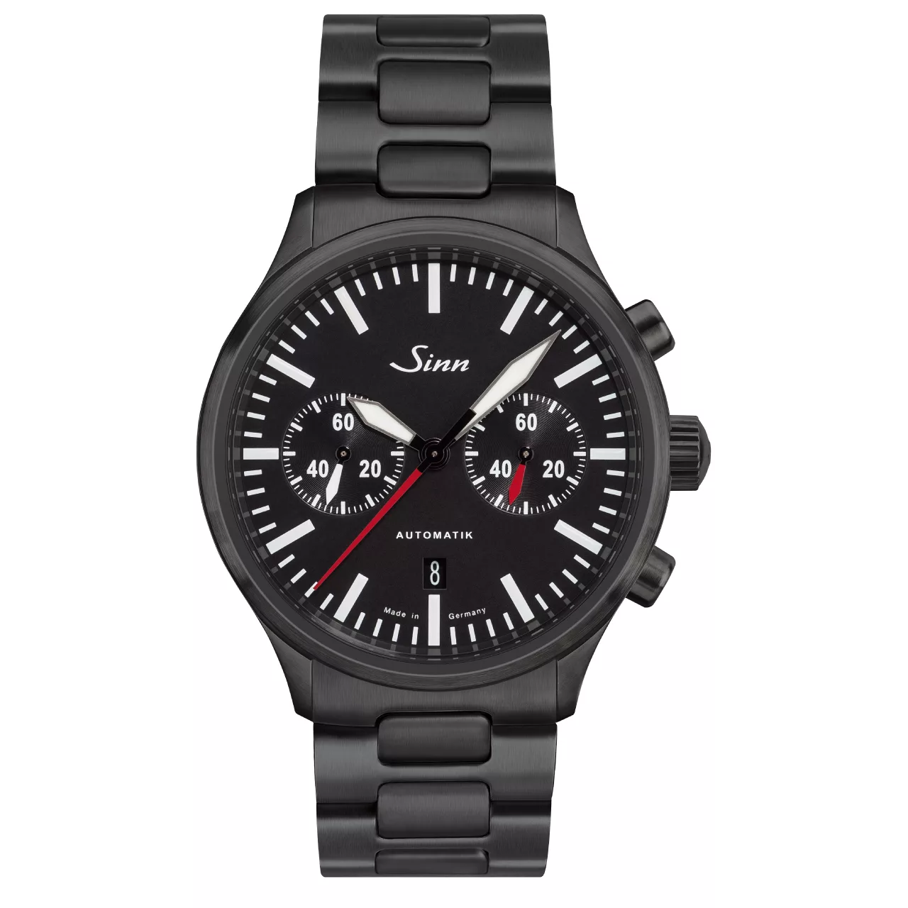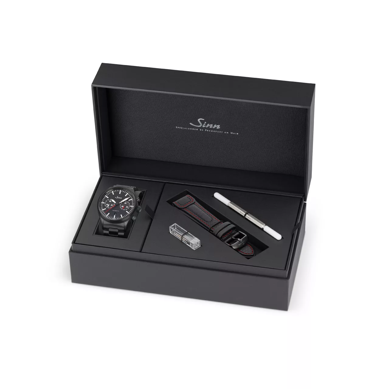 The case continues that same philosophy of durability and technical precision. Made from stainless steel with polished and satinised surfaces, it is fitted with Sinn’s black hard coating on a TEGIMENT Technology basis, enhancing surface hardness while reinforcing the watch’s bold, professional look. The overall result is a chronograph that feels robust and exacting, with a finish that underscores its role as a serious timekeeping instrument.