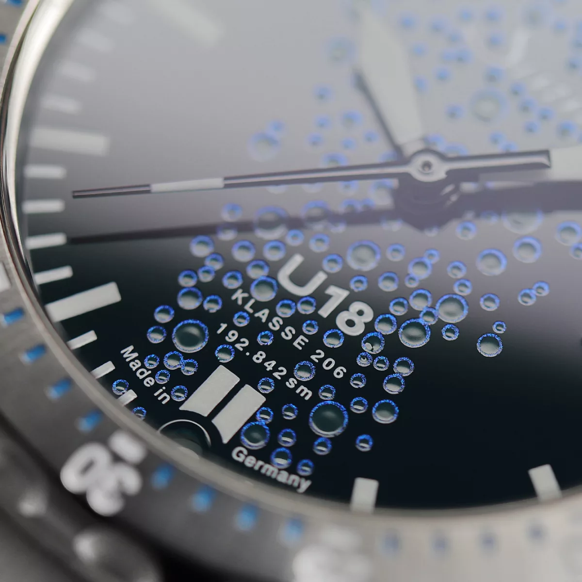 The U18´s anti-reflective sapphire crystal guarantees exceptional clarity and provides an optimal view of the high-gloss dial, which echoes the mesmerising blue nuances of the ocean. The dark bluish green base tone portrays the esoteric expanse of the open sea from a depth of around thirty metres, alluding to the operating range of the U 18 submarine, which was able to dive to depths of up to 100 metres. Stylised air bubbles that symbolise the rising air bubbles underscore the three-dimensional effect with metallic blues and greens. This variance brings a unique touch to the dial and catches the eye with an intriguing stereoscopic effect. As a historical memoir of the power of submarines, the dial features the number of nautical miles travelled and the U 18´s type designation. The case back is adorned with a matching silhouette of the Type 206 submarine. The U18 has been tested according to European diving equipment standards and certified by an independent institute, ensuring its durability and reliability.