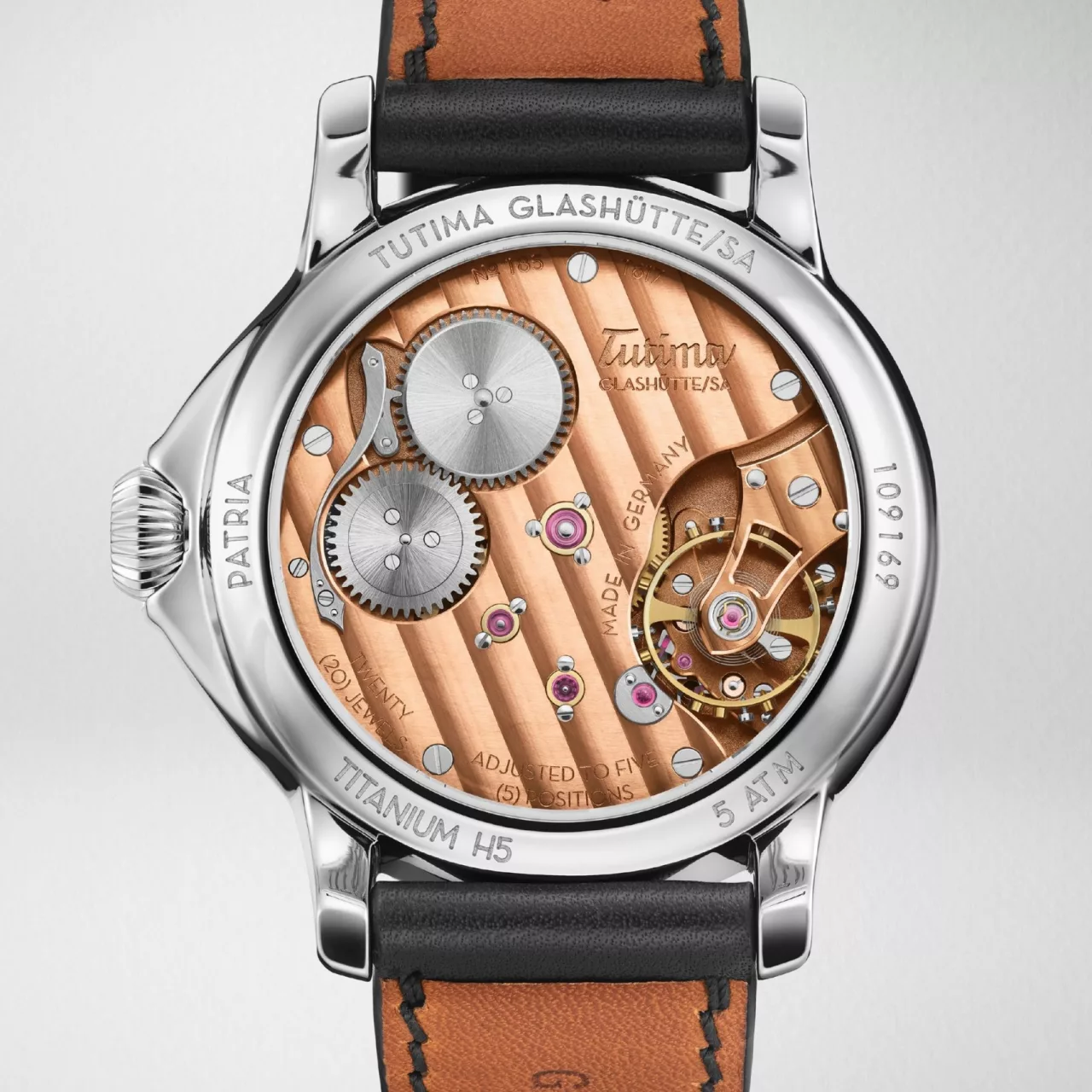 The polished Grade 5 titanium case measures 41 mm and represents the perfect fusion of strength and refinement. Titanium’s exceptional durability, corrosion resistance, and featherlight comfort make it the ideal companion to the Patria’s enduring design. A domed sapphire crystal provides a clear, anti-reflective view of the green dial beneath, while the fluted crown ensures precision winding through a newly engineered ratcheting mechanism – a tactile reminder of Tutima’s mechanical mastery.