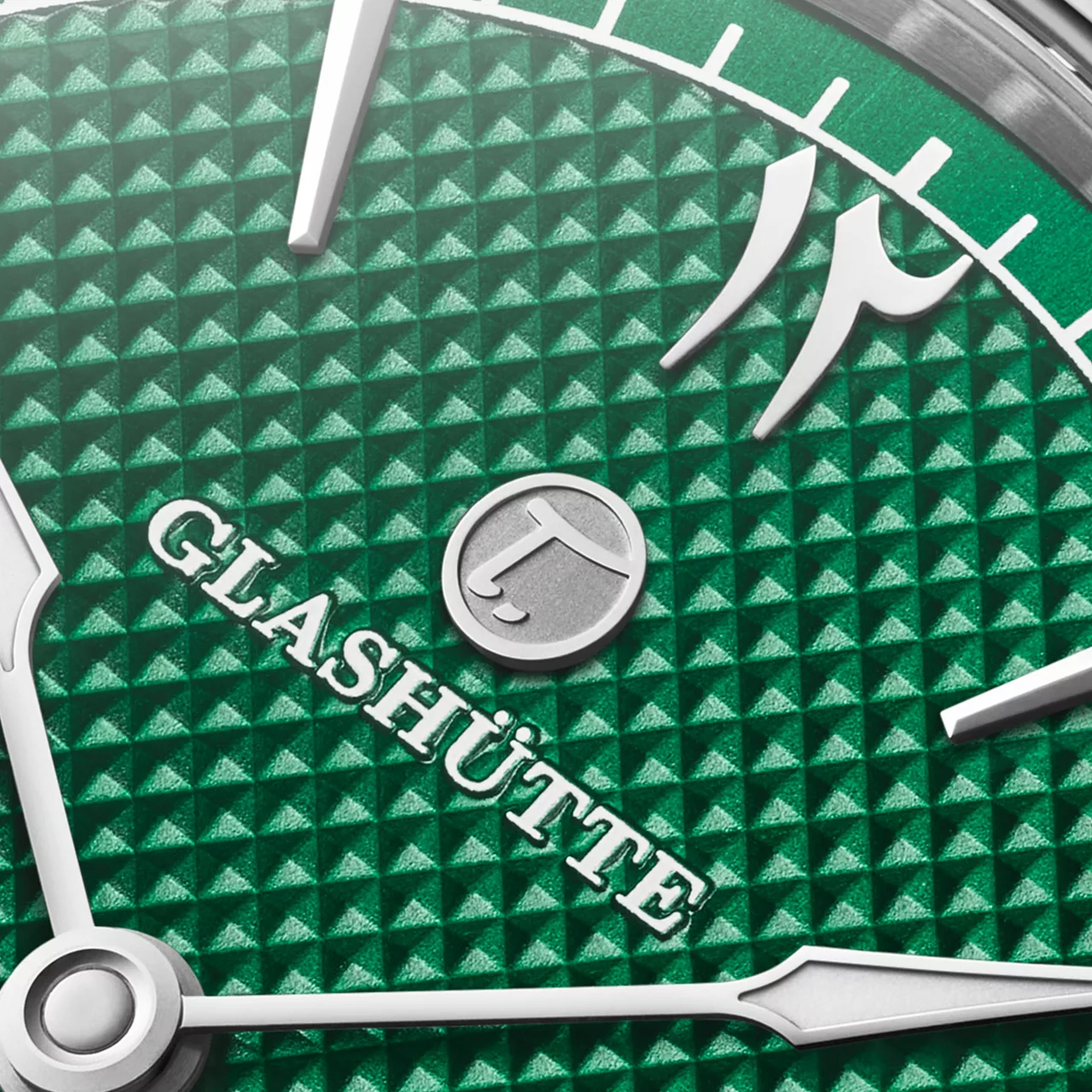 Its dial, rich with pyramid-textured depth, shifts between shades of moss and emerald as light dances across its surface. Applied, diamond-cut indices and finely polished hands illuminate the display, while for the first time, Arabic-Indian numerals appear at four, eight, and twelve o’clock – an elegant nod to the international spirit of fine horology.