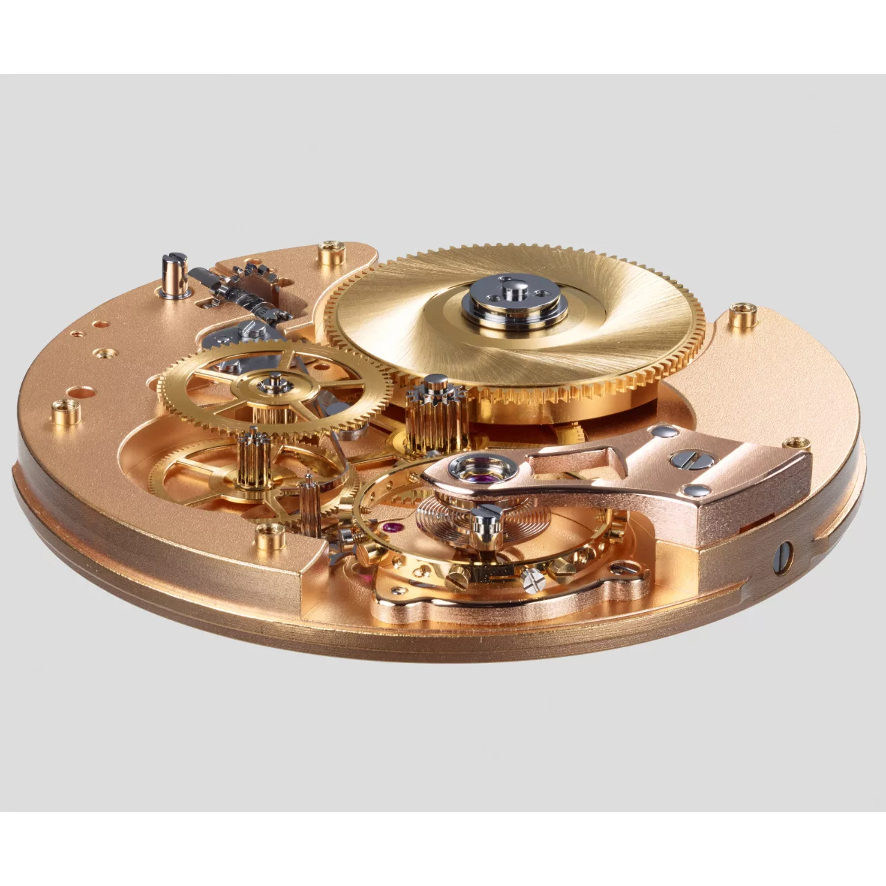 Inside, the hand-wound **Calibre 617** beats with precision and grace. Crafted from 171 components, it displays the full beauty of traditional Glashütte construction: a three-quarter plate with ribbing, hand-beveled edges, and gold chatons set with rubies. The open-worked balance cock offers a window into the free-sprung oscillation system, complete with a hand-bent Breguet overcoil. With a 65-hour power reserve, every detail of the movement is both aesthetic and functional perfection.