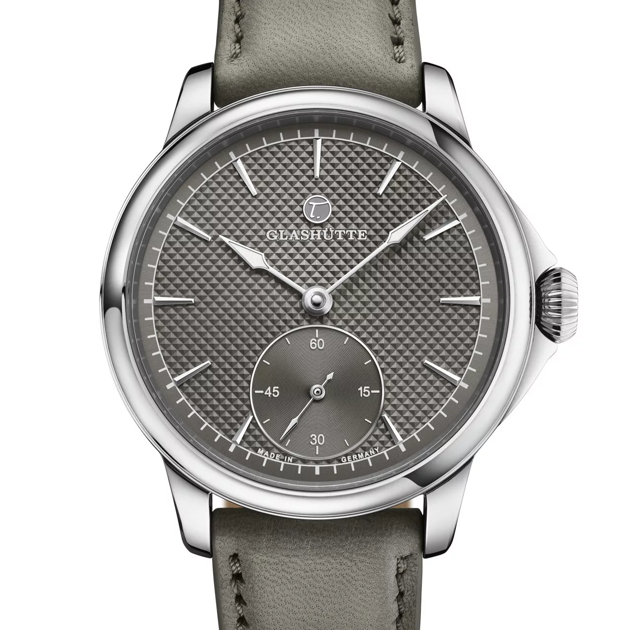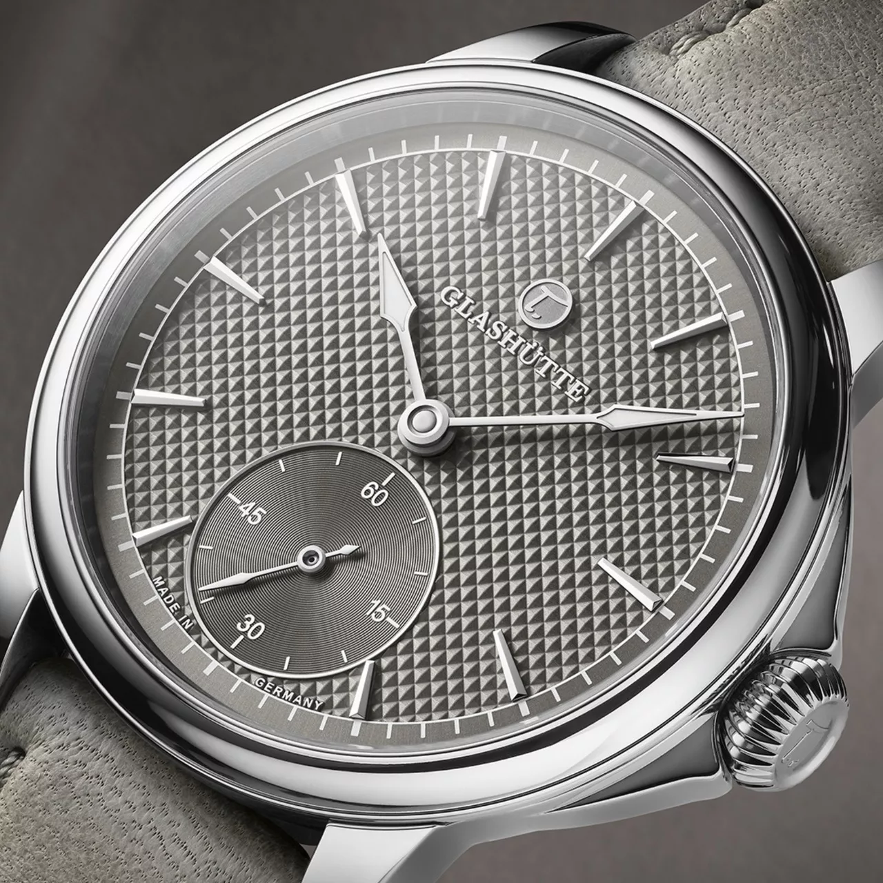 The 41 mm case is topped with a domed, anti-reflective sapphire crystal that frames the graphite dial. Subtle pyramid textures on the dial play with light, shifting from deep shadows to luminous highlights depending on the angle. A small seconds sub-dial with fine groove detailing, along with luminous steel hands and diamond-cut indices, reinforces the sense of balanced design and clarity.