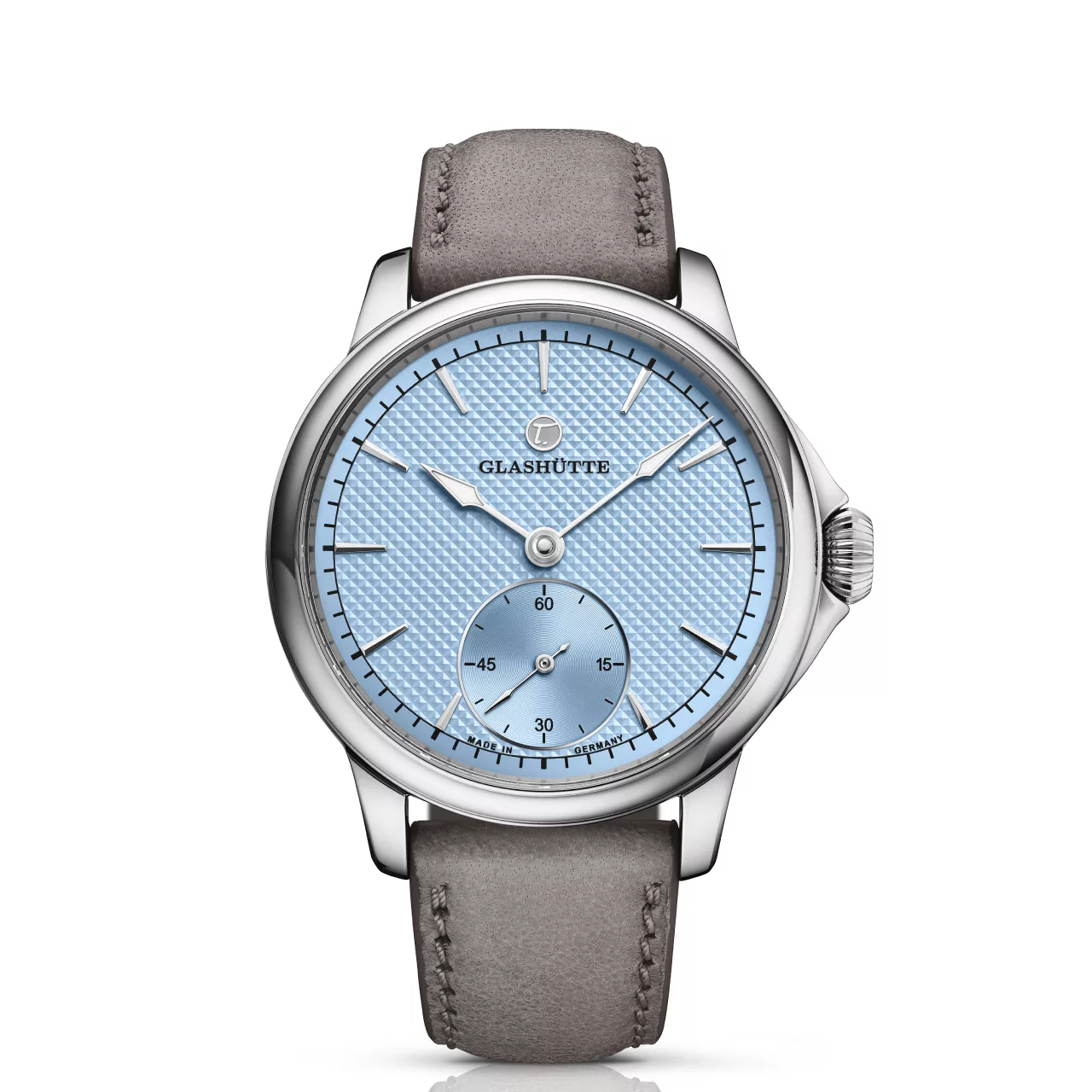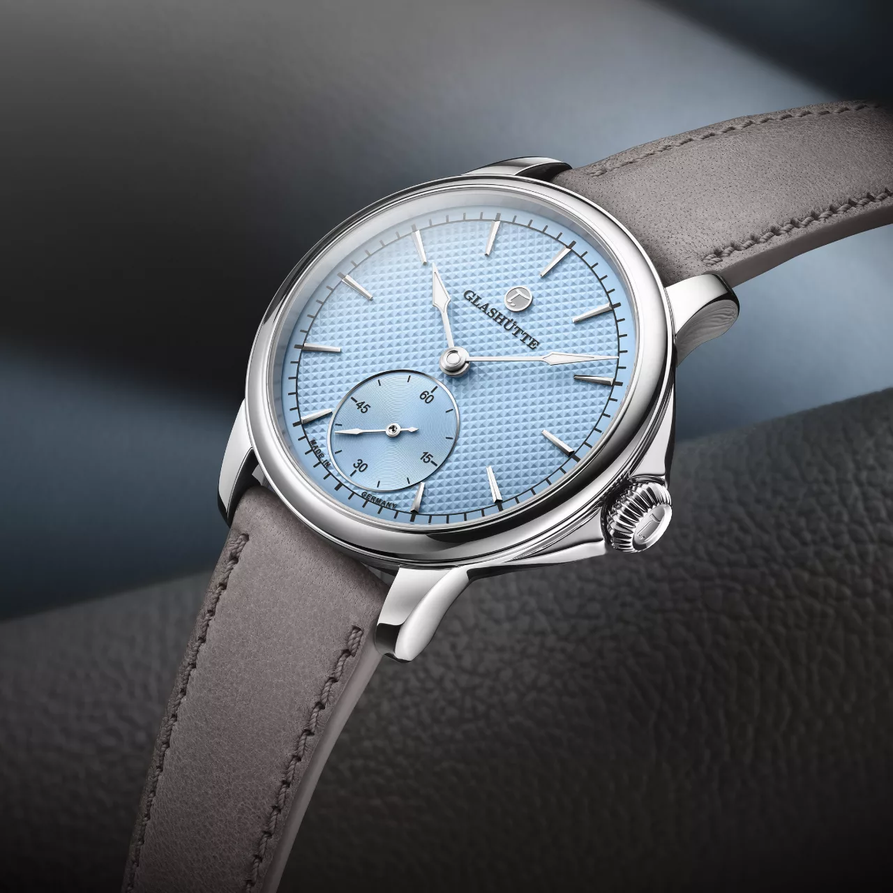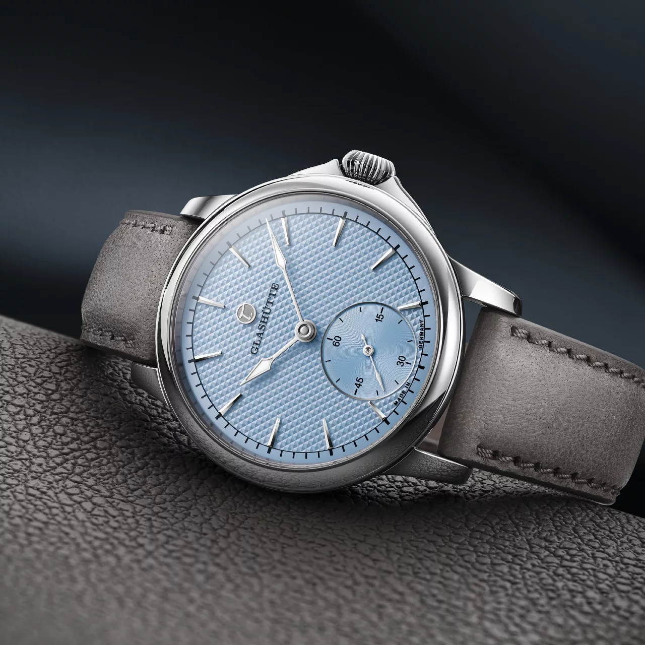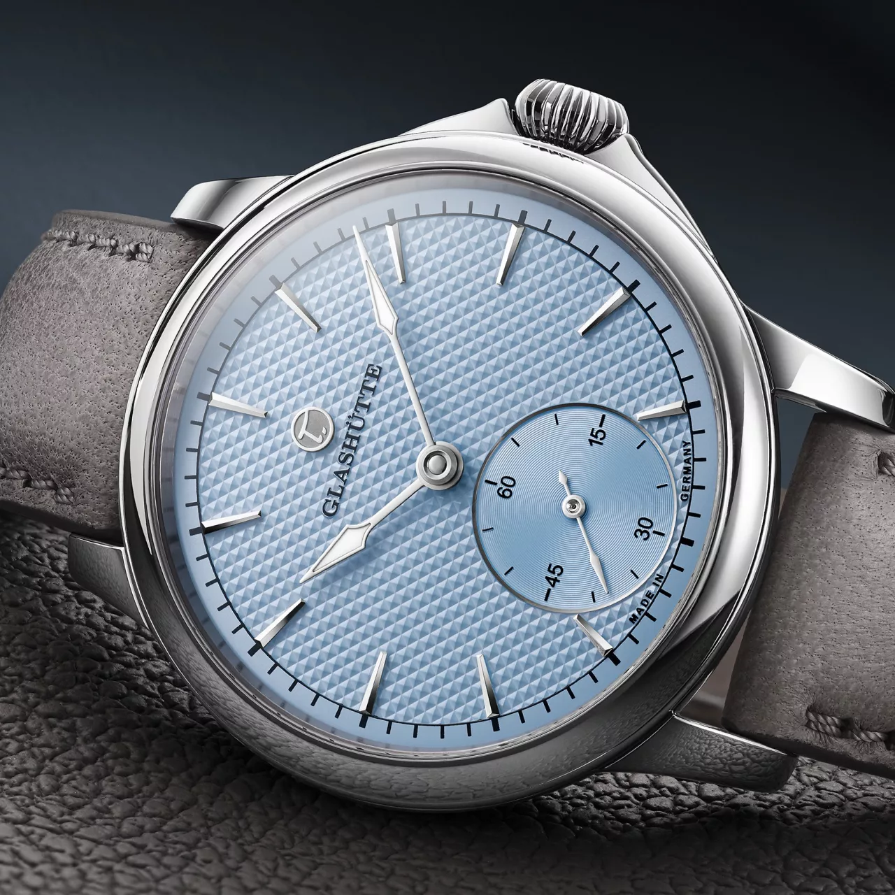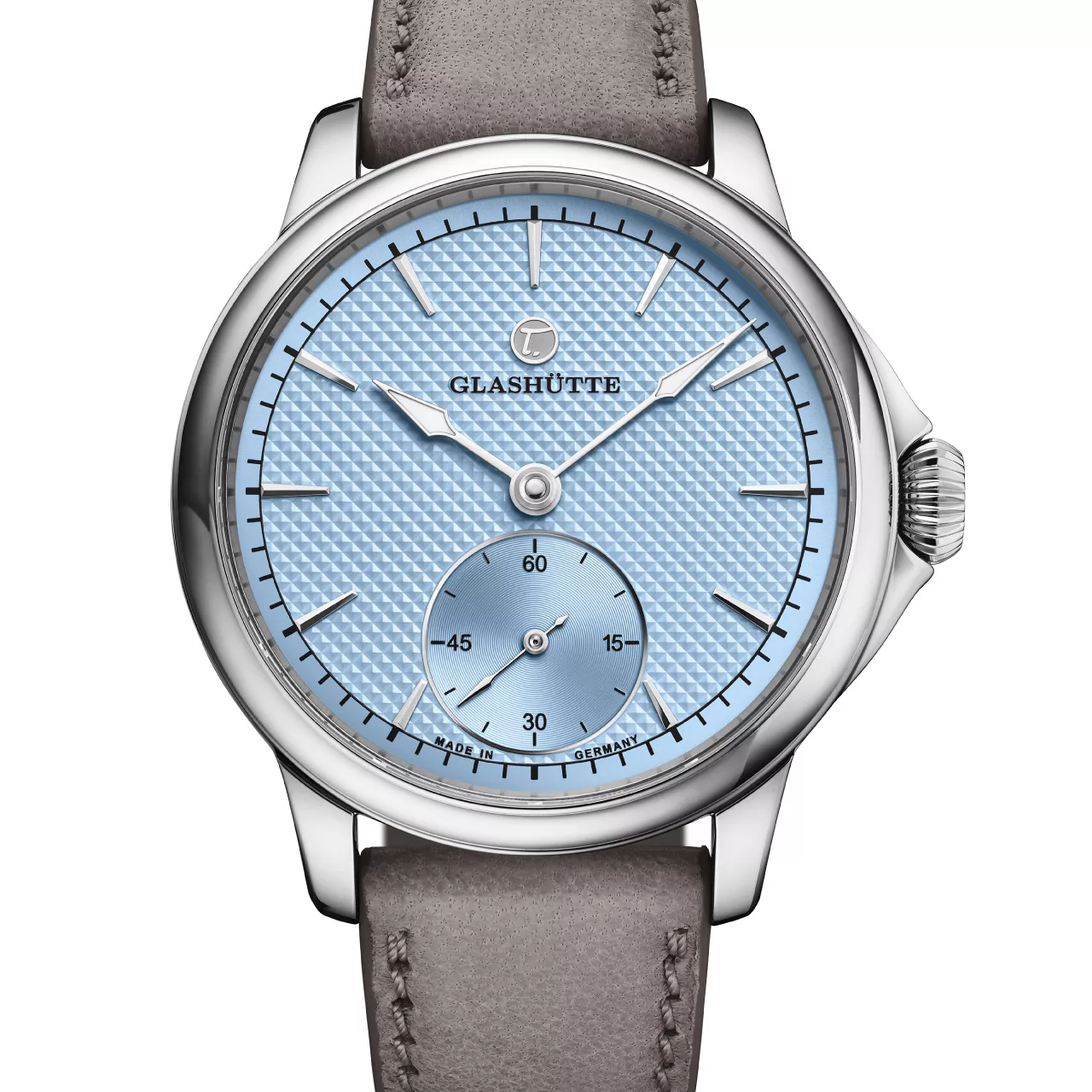 A recessed small seconds display with fine grooved texture introduces subtle contrast, while the flat outer minute track and precisely proportioned hands reinforce the dial’s harmonious balance. The historic Tutima logo from the brand’s founding era completes the design with quiet authority, linking the modern aesthetic to the company’s heritage in Glashütte.